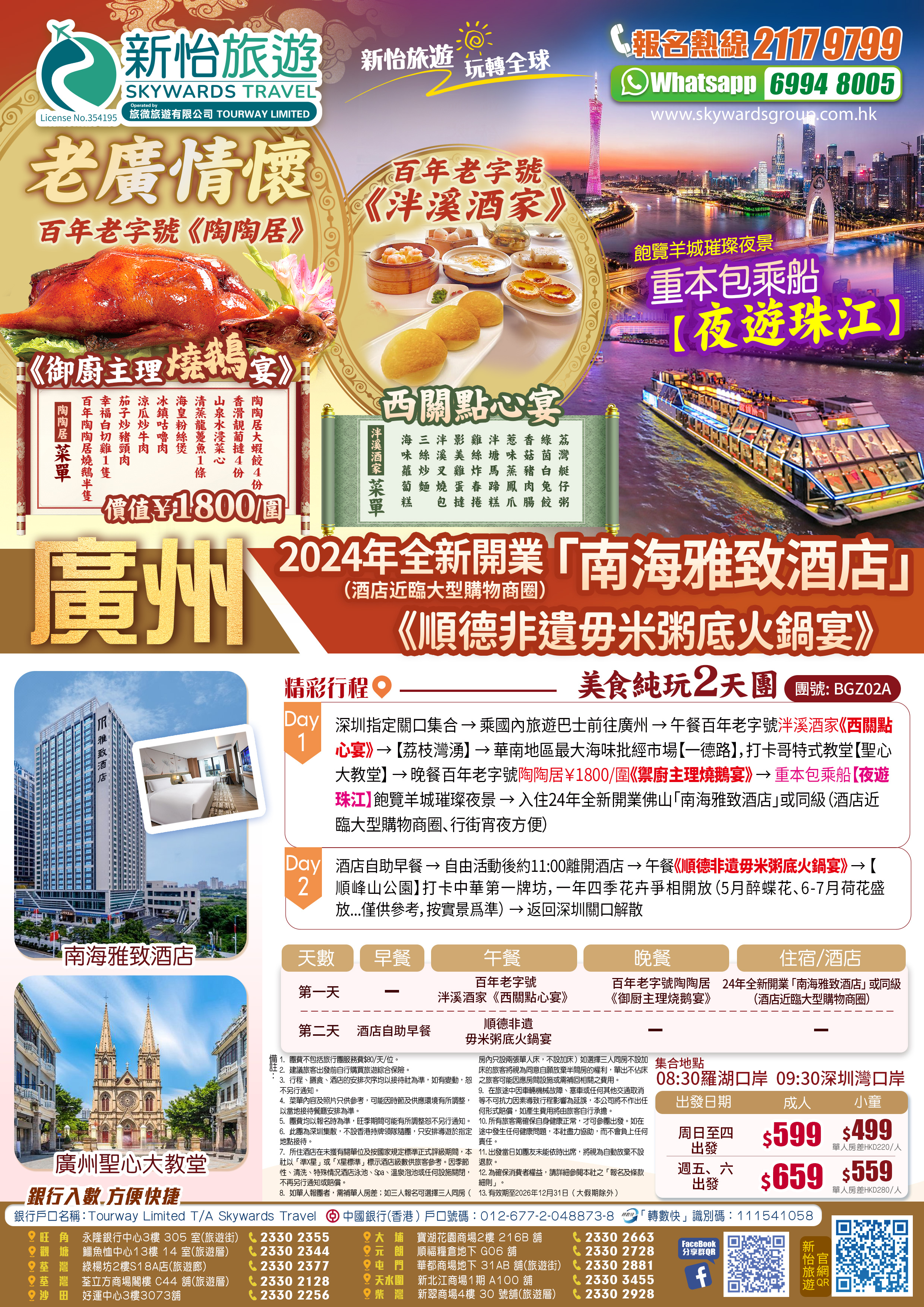 深圳指定關口集合→乘國內旅遊巴士前往廣州→午餐百年老字號泮溪酒家《西關點 心宴》→【荔枝灣涌】→華南地區最大海味批經市場【一德路】,打卡哥特式教堂【聖心 大教堂】→晚餐百年老字號陶陶居¥1800/圍《御厨主理燒鵝宴》→重本包乘船【夜遊珠 江】飽覽羊城璀璨夜景→入住24年全新開業佛山「南海雅致酒店」或同級,(酒店近臨 大型購物商圈、行街宵夜方便)