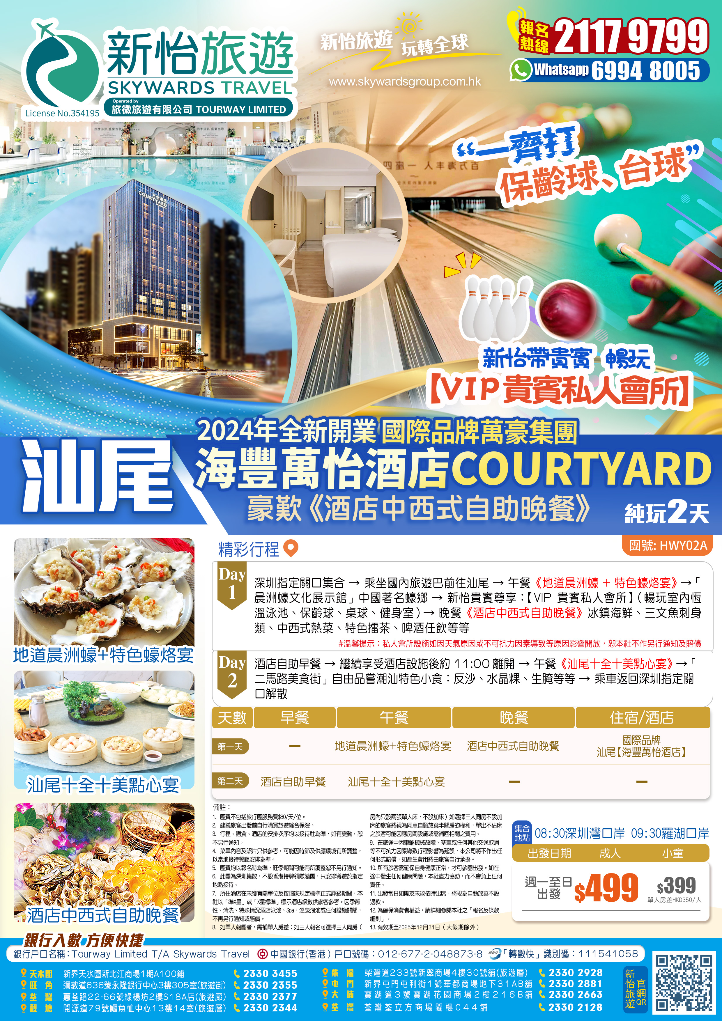 深圳指定關口集合—乘坐國內旅遊巴前往汕尾—午餐《地道晨洲蠔+特色蠔烙宴》—「晨洲蠔文化展示館」中國著名蠔鄉—新怡貴賓尊享:【VIP貴賓私人會所】(暢玩室內恆溫泳池、保齡球、桌球、健身室)—晚餐《酒店中西式自助晚餐》冰鎮海鮮、三文魚刺身類、現煎扒類、中西式熱菜、特色擂茶、啤酒任飲等等