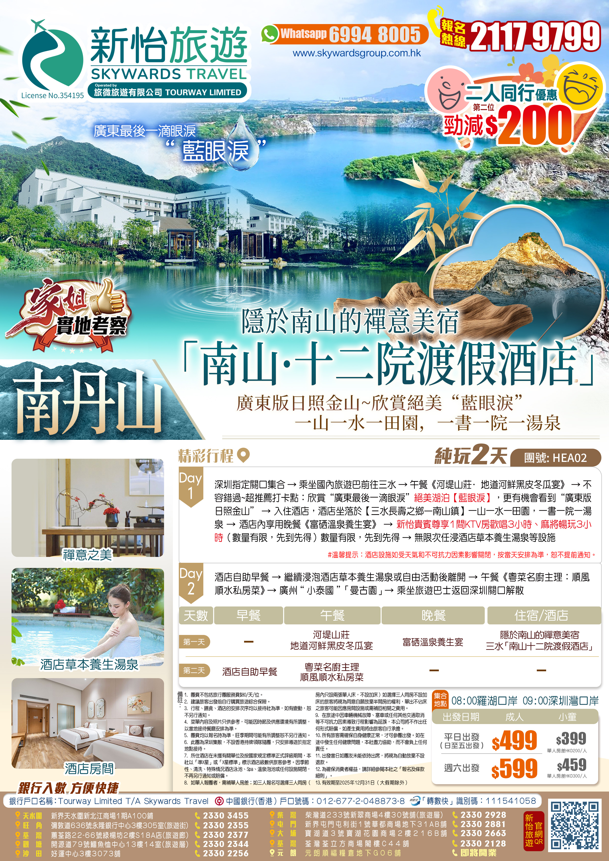 深圳指定關口集合—乘坐國內旅遊巴前往三水—午餐《當地新鮮食材:三水河鮮黑皮冬瓜宴》—不容錯過~超推薦打卡點:欣賞”廣東最後一滴眼淚”絕美湖泊【藍眼淚】,更有機會看到”廣東版日照金山”—入住酒店,酒店坐落於【三水長壽之鄉—南山鎮】一山一水一田園,一書一院一湯泉—酒店內享用晚餐《富硒溫泉養生宴》—新怡貴賓尊享1間KTV房歡唱4小時—電動麻將任玩(數量有限,先到先得)—無限次任浸酒店草本養生湯泉等設施