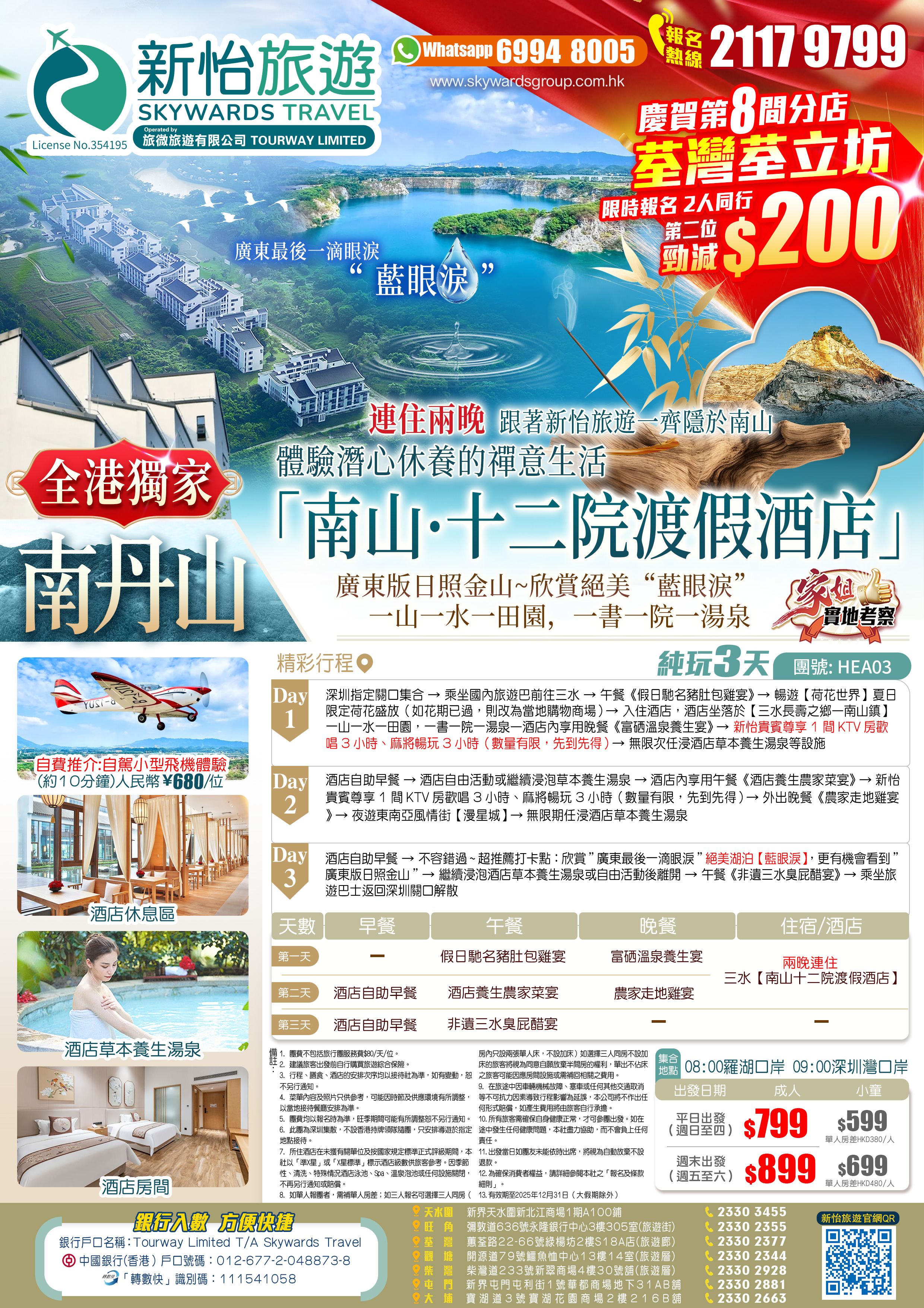 酒店自助早餐—不容錯過~超推薦打卡點:欣賞”廣東最後一滴眼淚”絕美湖泊【藍眼淚】,更有機會看到”廣東版日照金山”—繼續浸泡酒店草本養生湯泉或自由活動後離開—午餐《非遺三水臭屁醋宴》—乘坐旅遊巴士返回深圳關口解散