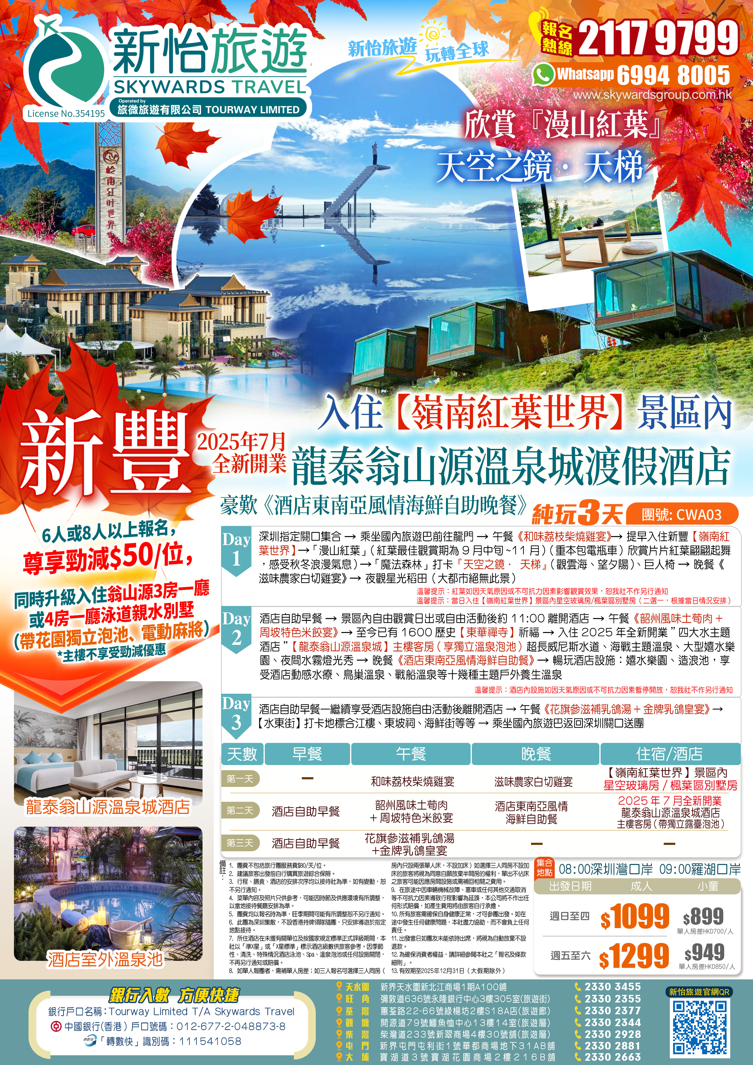 《季節限定》欣賞『漫山紅葉』打卡【天空之鏡·天梯】 入住兩晚靚酒店 新豐【嶺南紅葉世界】+2025年7月全新開業威尼斯水城【龍泰翁山源溫泉城渡假酒店】豪歎《酒店東南亞風情海鮮自助晚餐》 純玩3天