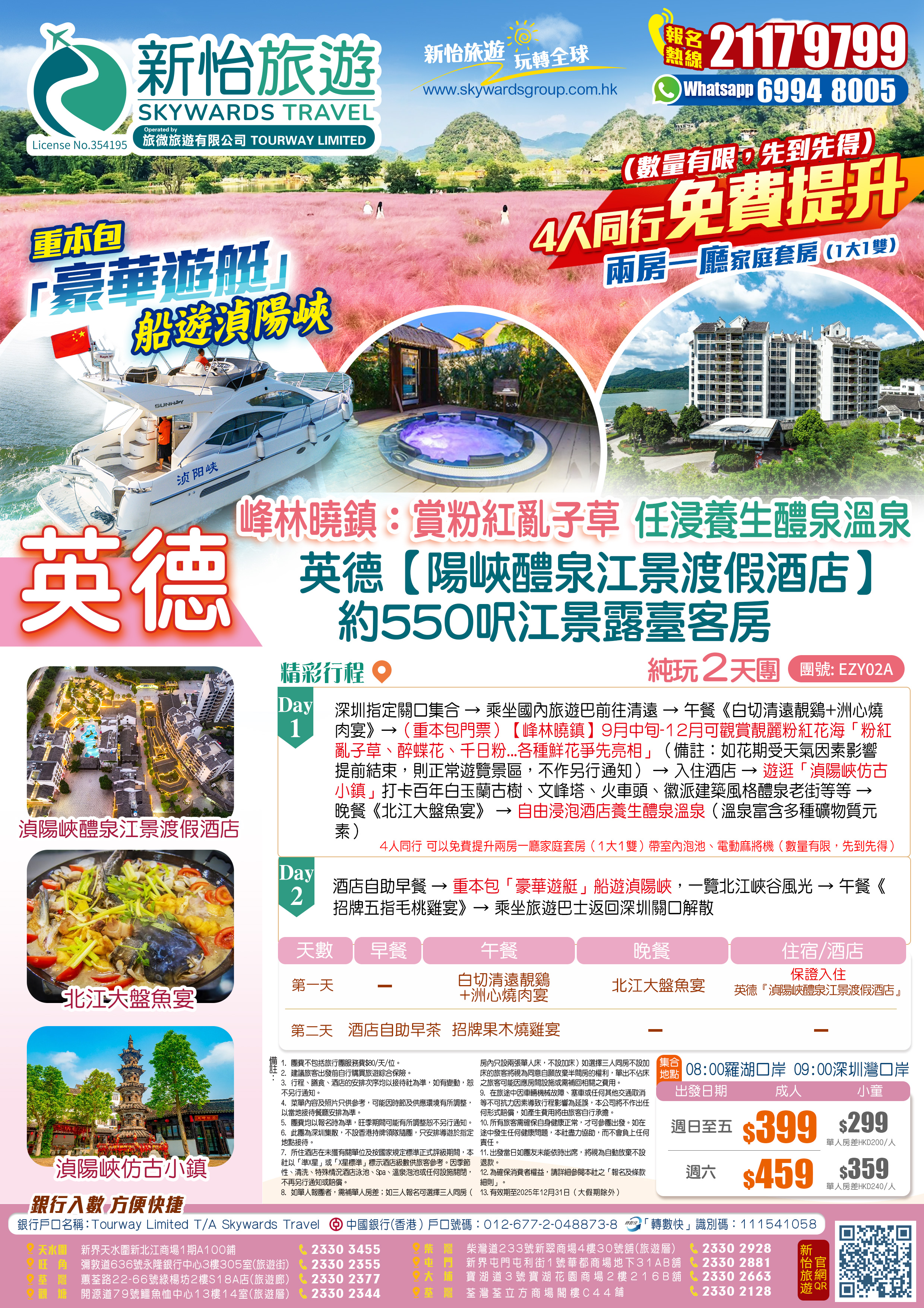 《季節限定》英西「峰林曉鎮」粉黛亂子草粉紅花海 粵北風光 重本包「豪華遊艇」船遊湞陽峽 一覽北江峽谷風光 任浸養生醴泉溫泉 保證入住英德【湞陽峽醴泉江景渡假酒店】約550呎江景露臺客房 純玩2天團