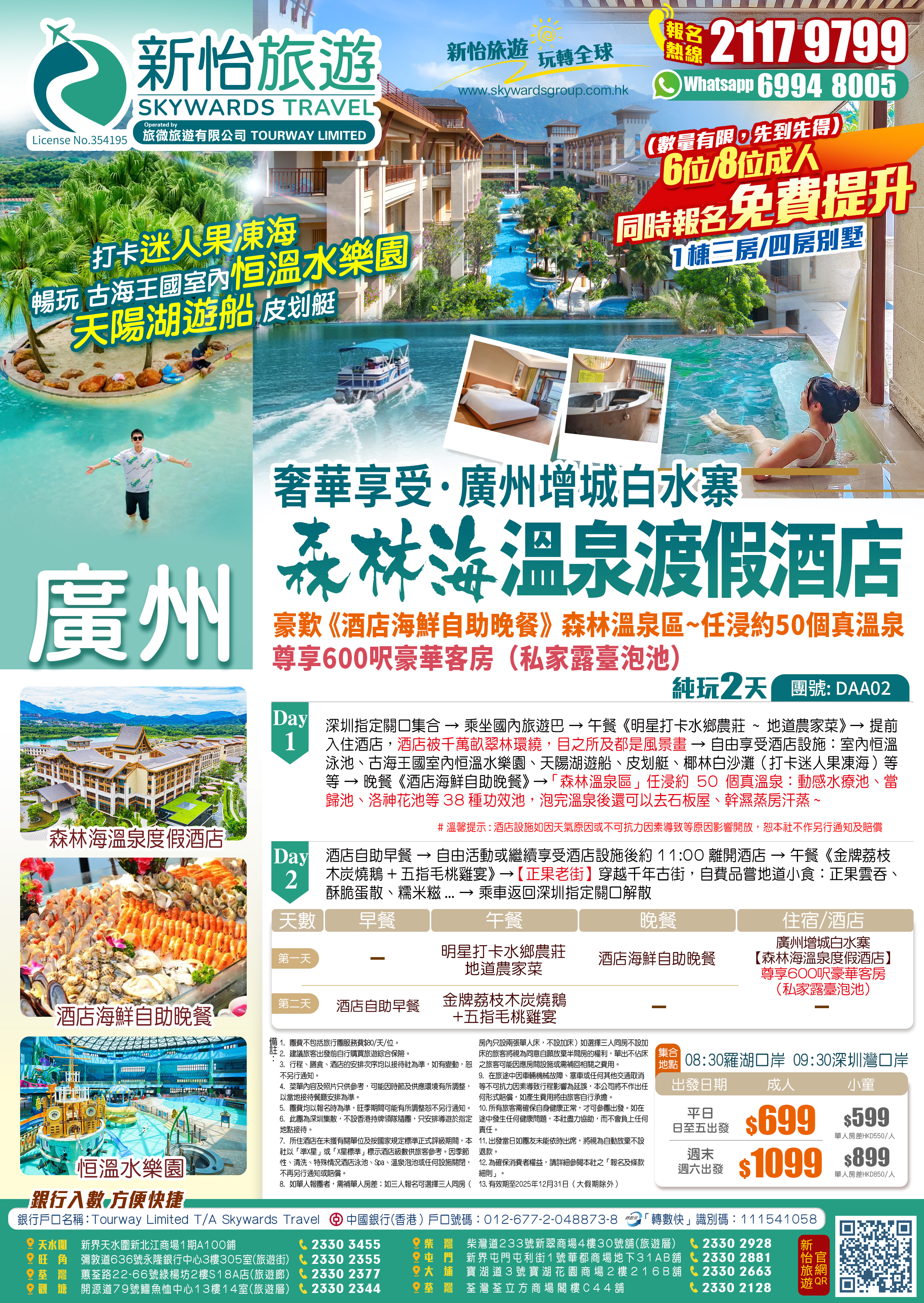 奢華享受 廣州增城白水寨【森林海溫泉渡假酒店】豪歎《酒店海鮮自助晚餐》尊享600呎豪華客房(私家露臺泡池)森林溫泉區~任浸約50個真溫泉 打卡迷人果凍海 暢玩 古海王國室內恒溫水樂園 天陽湖遊船 皮划艇 純玩2天