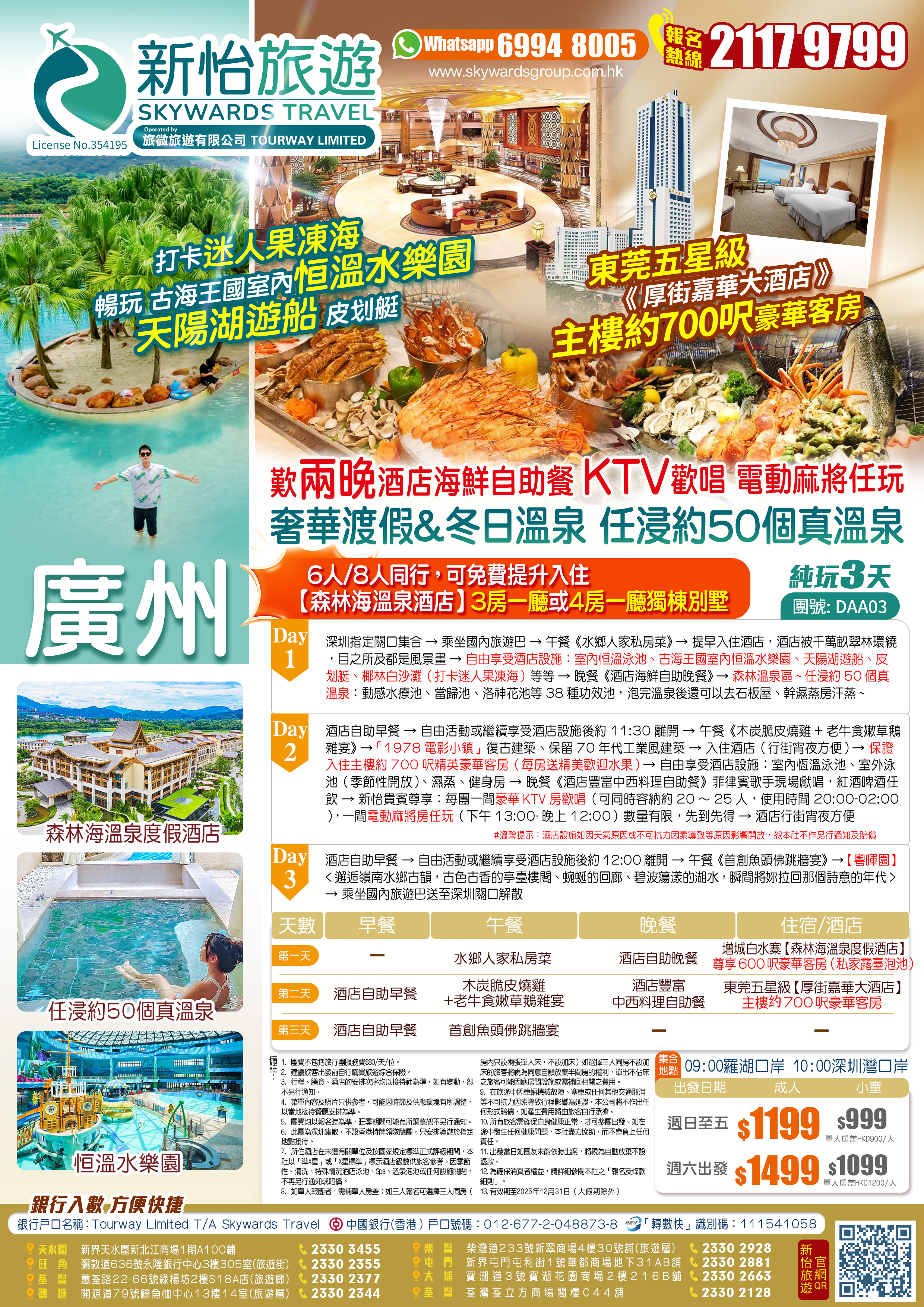 奢華渡假&冬日溫泉 廣州”後花園”白水寨【增城森林海溫泉酒店】+東莞五星級【厚街嘉華大酒店】主樓约700呎豪華客房 嘆兩晚酒店海鮮自助餐 KTV歡唱 電動麻將任玩 任浸約50個真溫泉 暢玩古海王國室內恒溫水樂園 純玩3天