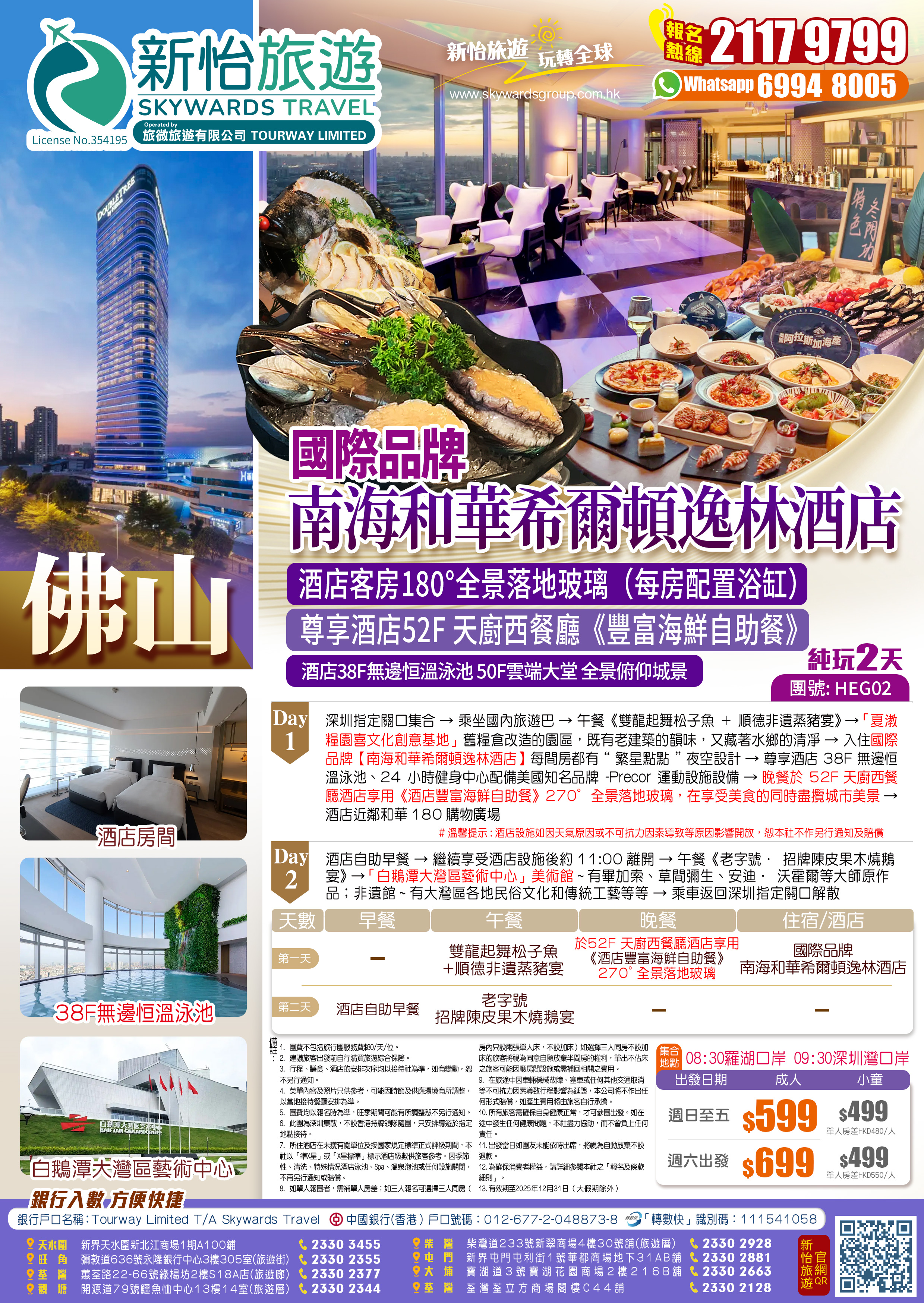 國際品牌【南海和華希爾頓逸林酒店】酒店客房180°全景落地玻璃(每房配置浴缸) 尊享酒店52F 天廚西餐廳《豐富海鮮自助餐》 酒店38F無邊恒溫泳池、24小時健身中心 50F雲端大堂 全景俯仰城景 純玩2天