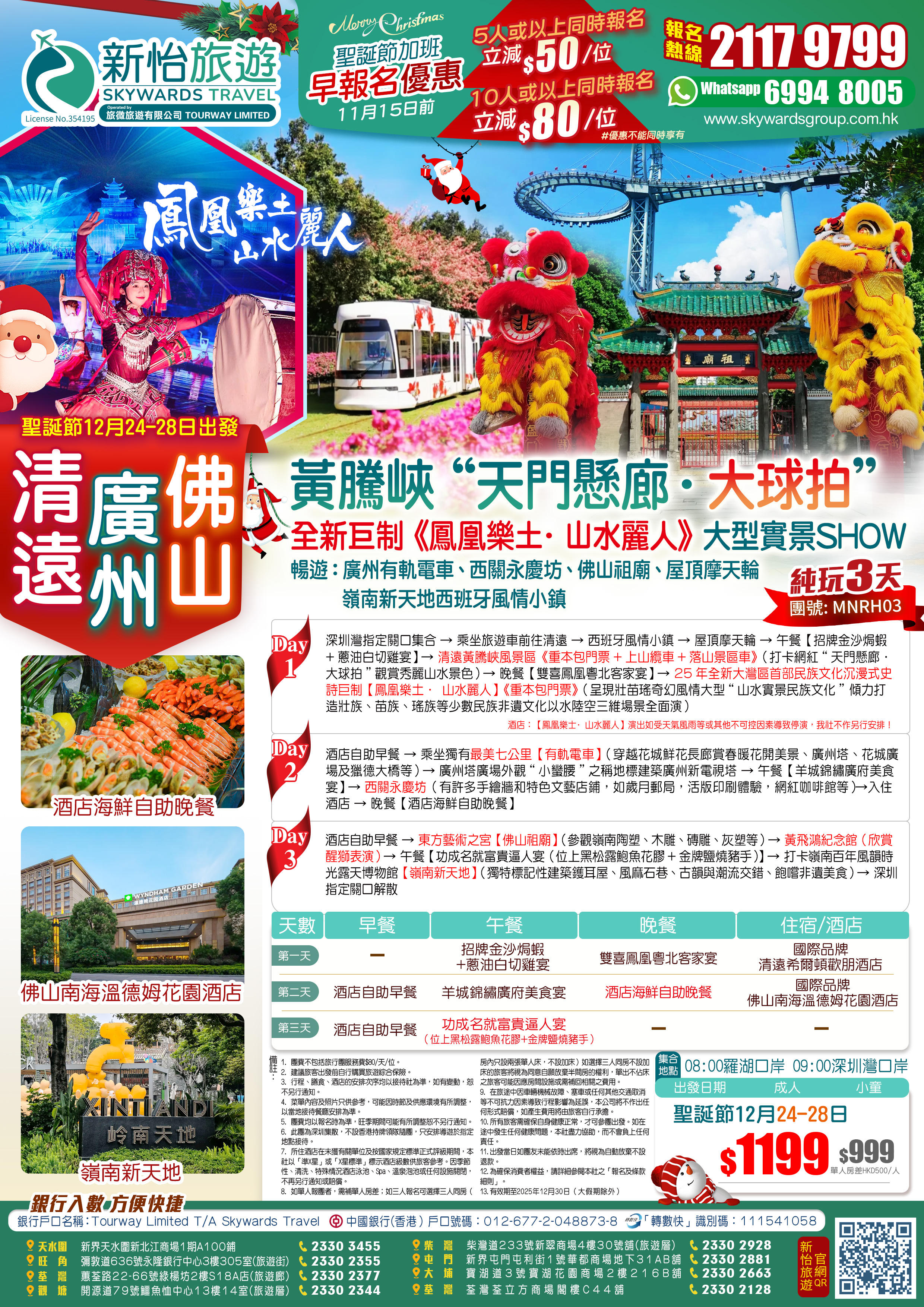 深圳灣指定關口集合→乘坐旅遊車前往清遠→西班牙風情小鎮→屋頂摩天輪→午餐【招牌金沙焗蝦+蔥油白切雞宴】→清遠黃騰峽風景區《重本包門票+上山纜車+落山景區車》(打卡網紅“天門懸廊·大球拍”觀賞秀麗山水景色)→晚餐【雙喜鳳凰粵北客家宴】→25年全新大灣區首部民族文化沉漫式史詩巨制【鳳凰樂土·山水麗人】《重本包門票》(呈現壯苗瑤奇幻風情大型“山水實景民族文化” 傾力打造壯族、苗族、瑤族等少數民族非遺文化以水陸空三維場景全面演) 備註:【鳳凰樂士·山水麗人】演出如受天氣風雨等或其他不可控因素導致停演,我社不作另行安排!