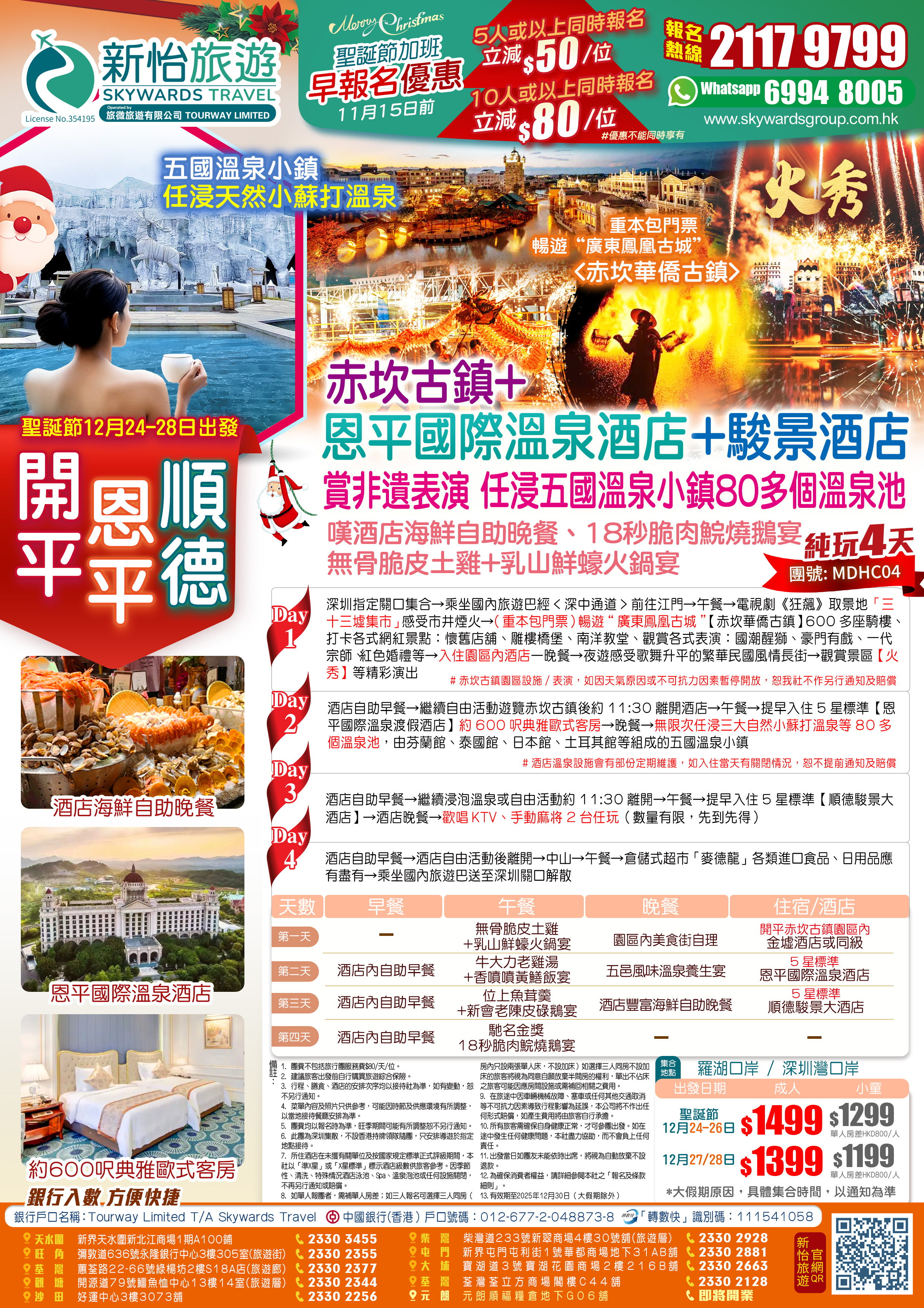 【聖誕加班】廣東民國浪漫僑鄉古城【赤坎古鎮】+【恩平國際溫泉酒店】+【順德駿景酒店】 賞非遺表演 任浸五國溫泉小鎮80多個溫泉池 嘆《酒店海鮮自助晚餐》KTV歡唱 麻將任玩 純玩4天