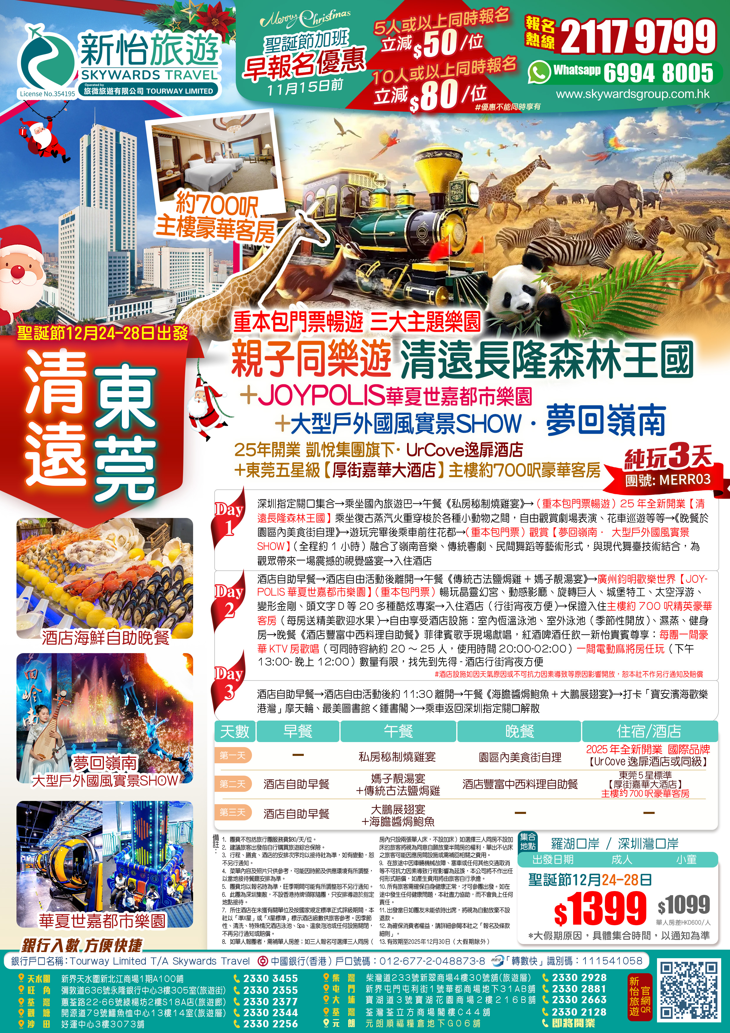 【聖誕加班】親子同樂遊25年全新開業「清遠長隆森林王國」+「夢回嶺南·大型戶外國風實景SHOW」+ 亞洲室內超級樂園「JOYPOLIS華夏世嘉都市樂園」+東莞五星級【厚街嘉華大酒店】主樓约700呎豪華客房 嘆《酒店海鮮自助晚餐》 包酒店KTV歡唱 電動麻將任玩 純玩3天