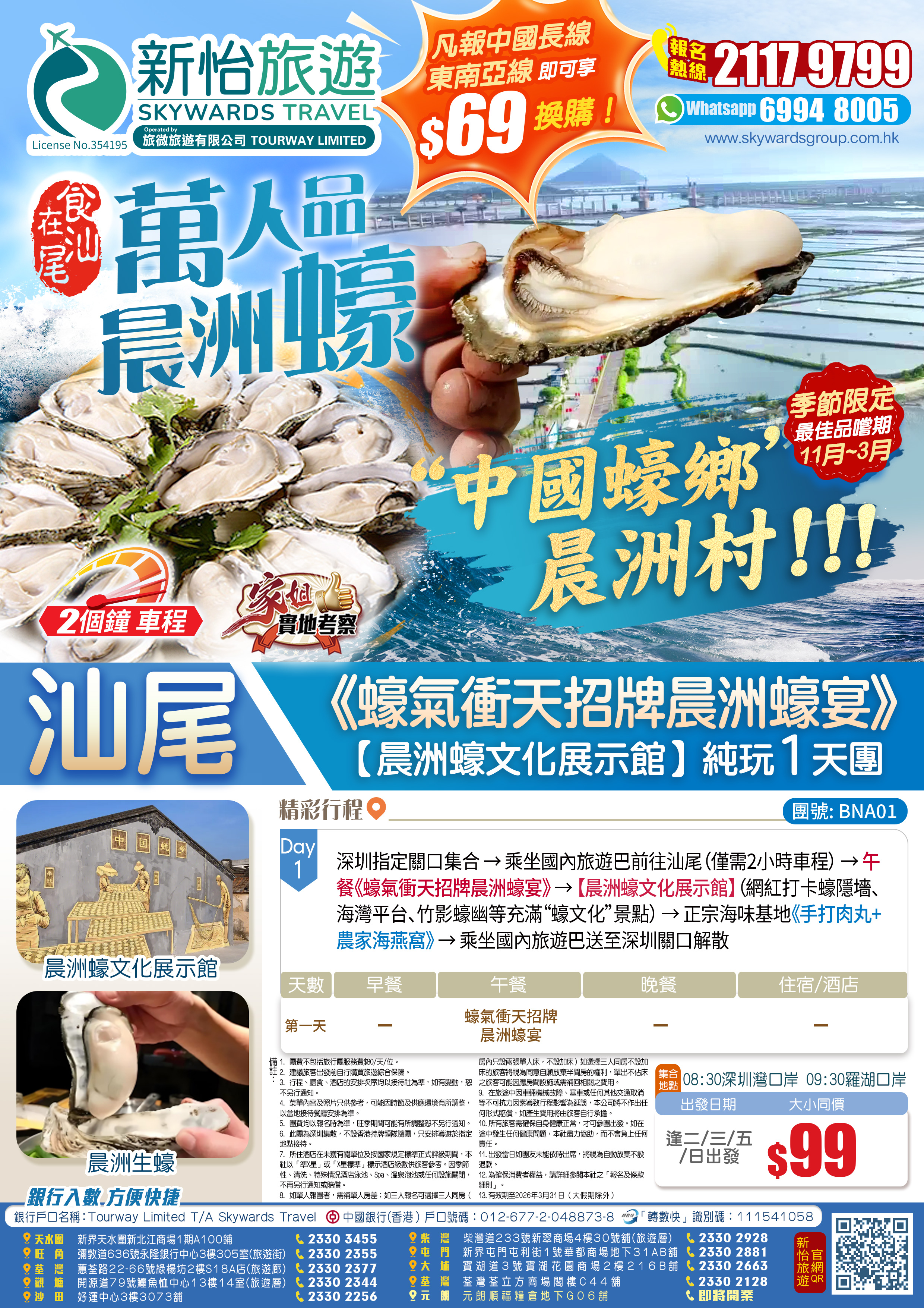 深圳指定關口集合→乘坐國內旅遊巴前往汕尾(僅需2小時車程)→午餐《蠔氣衝天招牌晨洲蠔宴》>【晨洲蠔文化展示館】(網紅打卡蠔隱墙,海灣平台、竹影蠔幽等充滿“蠔文化”景點)→正宗海味基地《手打肉丸+農家海燕窩》→乘坐國內旅遊巴送至深圳關口解散