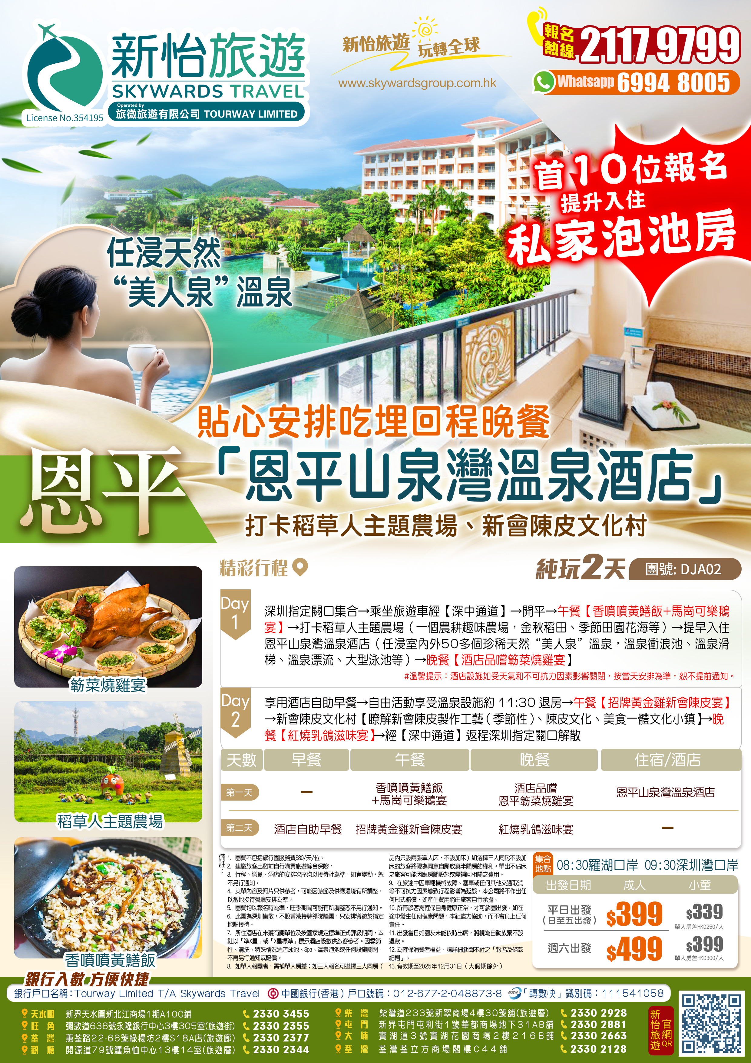 (首10位報名提升入住私家泡池房)恩平山泉灣溫泉酒店 任浸天然“美人泉”溫泉打卡稻草人主題農場、新會陳皮文化村【貼心安排吃埋回程晚餐】純玩2天