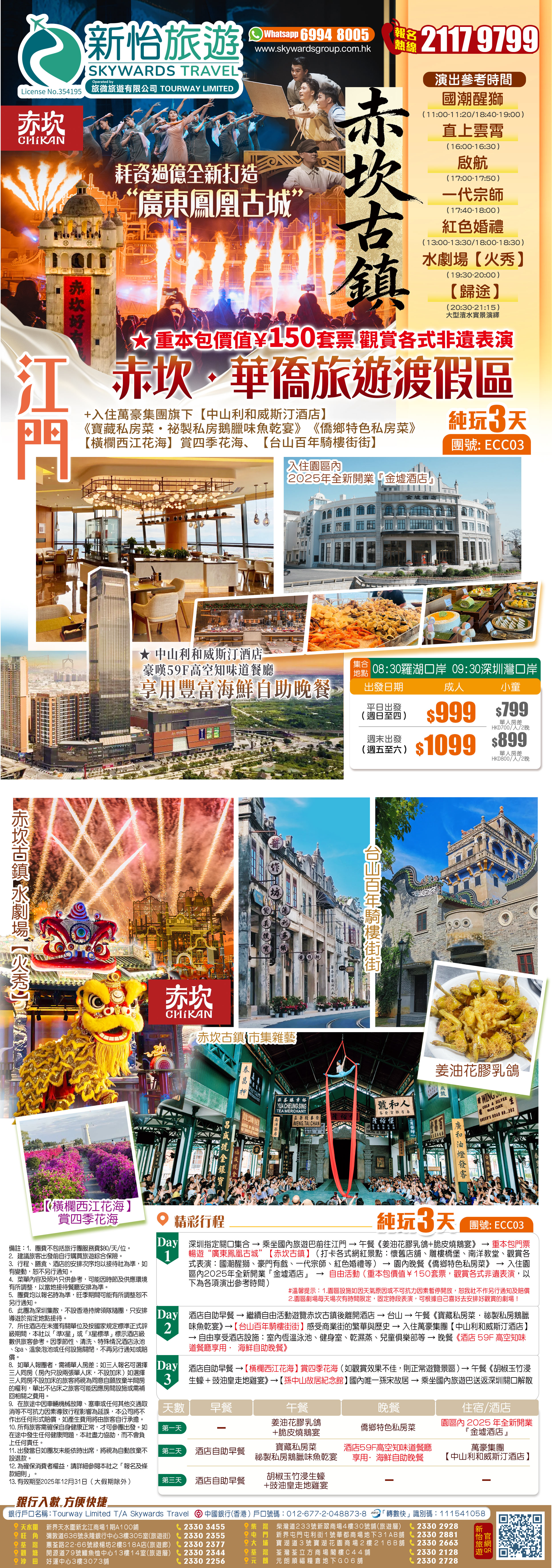 深圳指定關口集合—乘坐國內旅遊巴前往江門—午餐《姜油花膠乳鴿+脆皮燒鵝宴》—重本包門票暢遊“廣東鳳凰古城”【赤坎古鎮】(打卡各式網紅景點:懷舊店舖、雕樓橋堡、南洋教堂、觀賞各式表演:國潮醒獅、豪門有戲、一代宗師、紅色婚禮等)—園內晚餐《僑鄉特色私房菜》—入住園區內2025年全新開業『金墟酒店』—自由活動(重本包價值¥150套票,觀賞各式非遺表演,以下為各項演出參考時間)