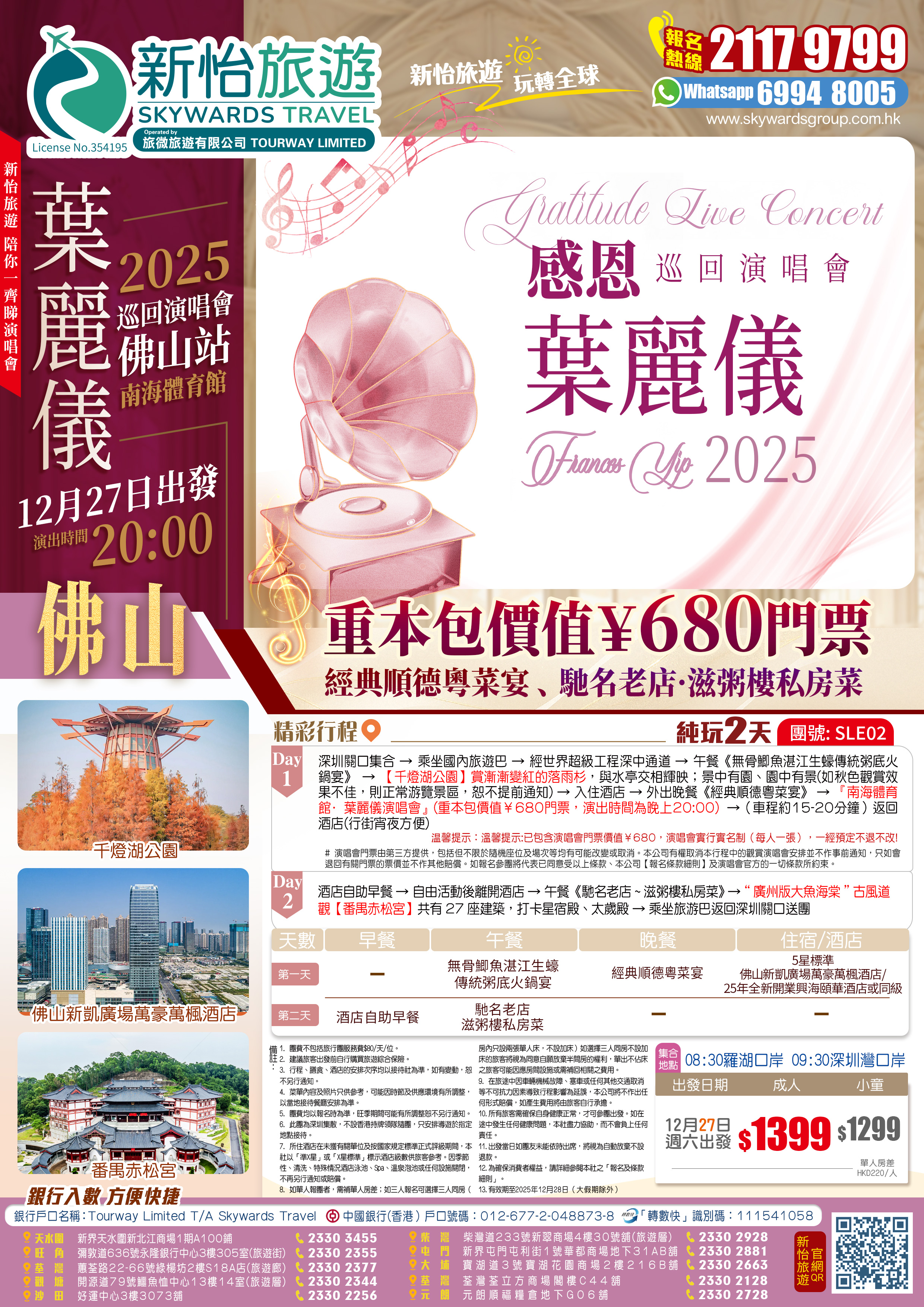 深圳關口集合—乘坐國內旅遊巴—經世界超級工程深中通道—午餐《無骨鯽魚湛江生蠔傳統粥底火鍋宴》—【千燈湖公園】賞漸漸變紅的落雨杉,與水亭交相輝映;景中有園、園中有景(如秋色觀赏效果不佳,則正常游覽景區,恕不提前通知)—入住酒店—外出晚餐《經典順德粵菜宴》—『南海體育館·葉麗儀演唱會』(重本包價值¥680門票,演出時間為晚上20:00) —(車程約15-20分鐘)返回酒店(行街宵夜方便)