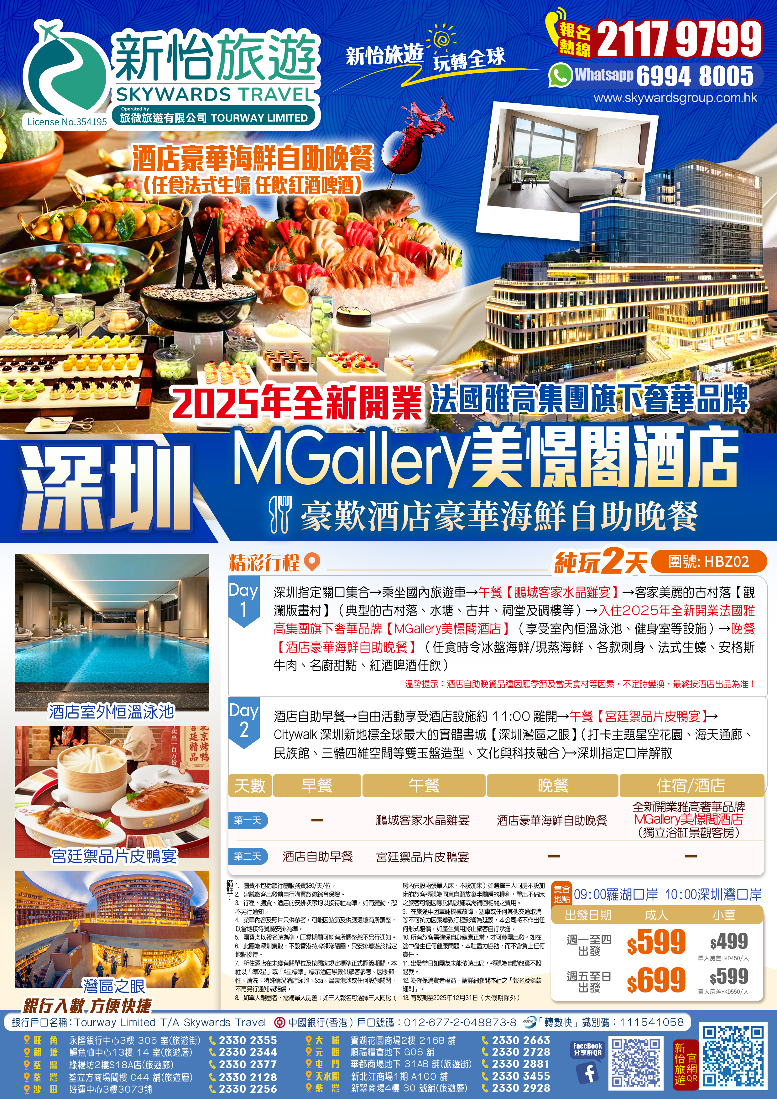 深圳指定關口集合→乘坐國內旅遊車→午餐【鵬城客家水晶雞宴】→客家美麗的古村落【觀瀾版畫村】(典型的古村落、水塘、古井、祠堂及碉樓等)→入住2025年全新開業法國雅高集團旗下奢華品牌【MGallery美憬閣酒店】(享受室內恒溫泳池、健身室等設施)→晚餐【酒店豪華海鮮自助晚餐】(任食時令冰盤海鮮/現蒸海鮮、各款刺身、法式生蠔、安格斯牛肉、名廚甜點、紅酒啤酒任飲)