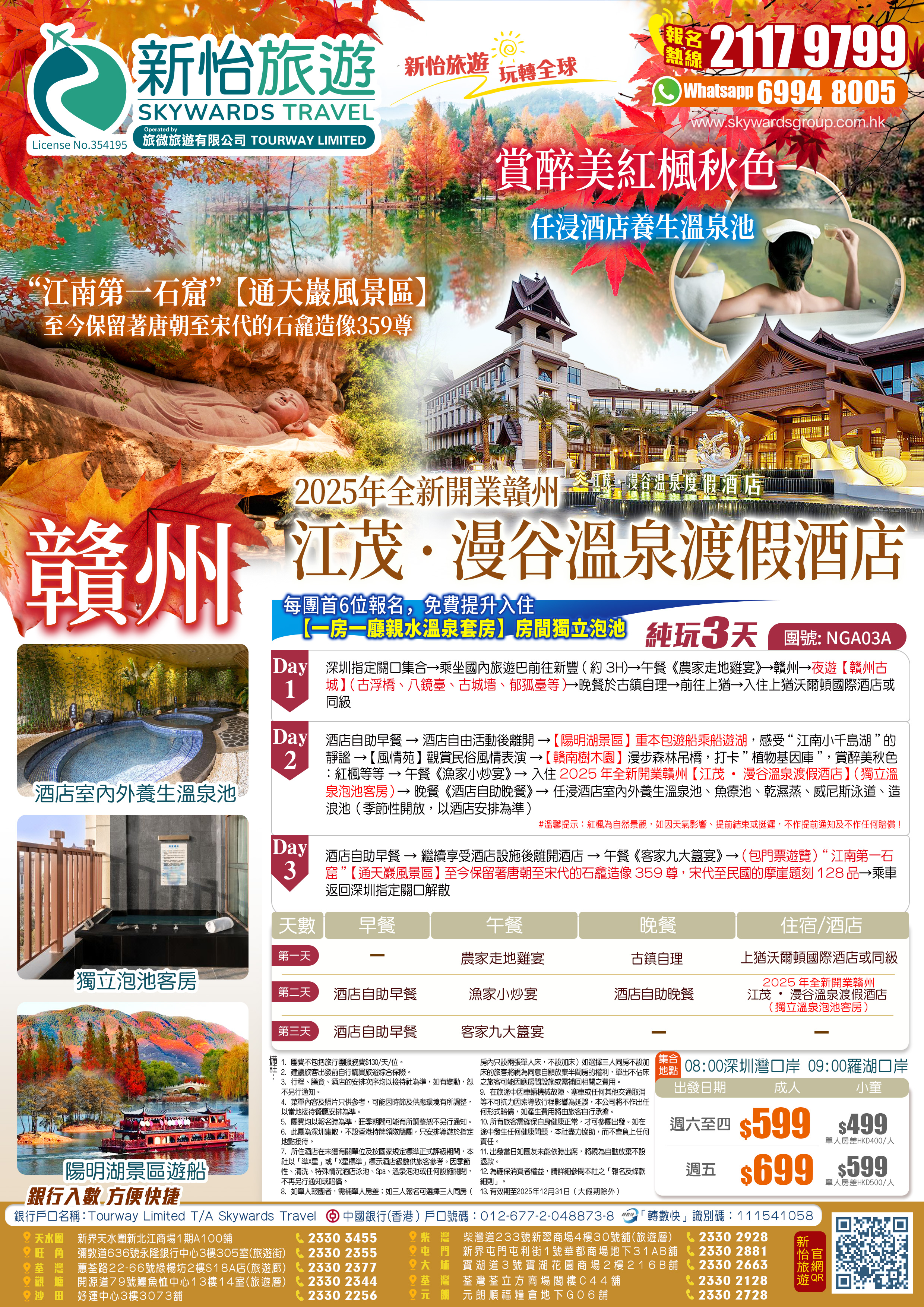 酒店自助早餐—酒店自由活動後離開—【陽明湖景區】重本包遊船乘船遊湖,感受“江南小千島湖”的靜謐—【風情苑】觀賞民俗風情表演—【贛南樹木園】漫步森林吊橋,打卡”植物基因庫”,賞醉美秋色:紅楓等等—午餐《漁家小炒宴》—入住2025年全新開業贛州【江茂▪漫谷溫泉渡假酒店】(獨立溫泉泡池客房)—晚餐《酒店自助晚餐》—任浸酒店室內外養生溫泉池、魚療池、乾濕蒸、威尼斯泳道、造浪池(季節性開放,以酒店安排為準)