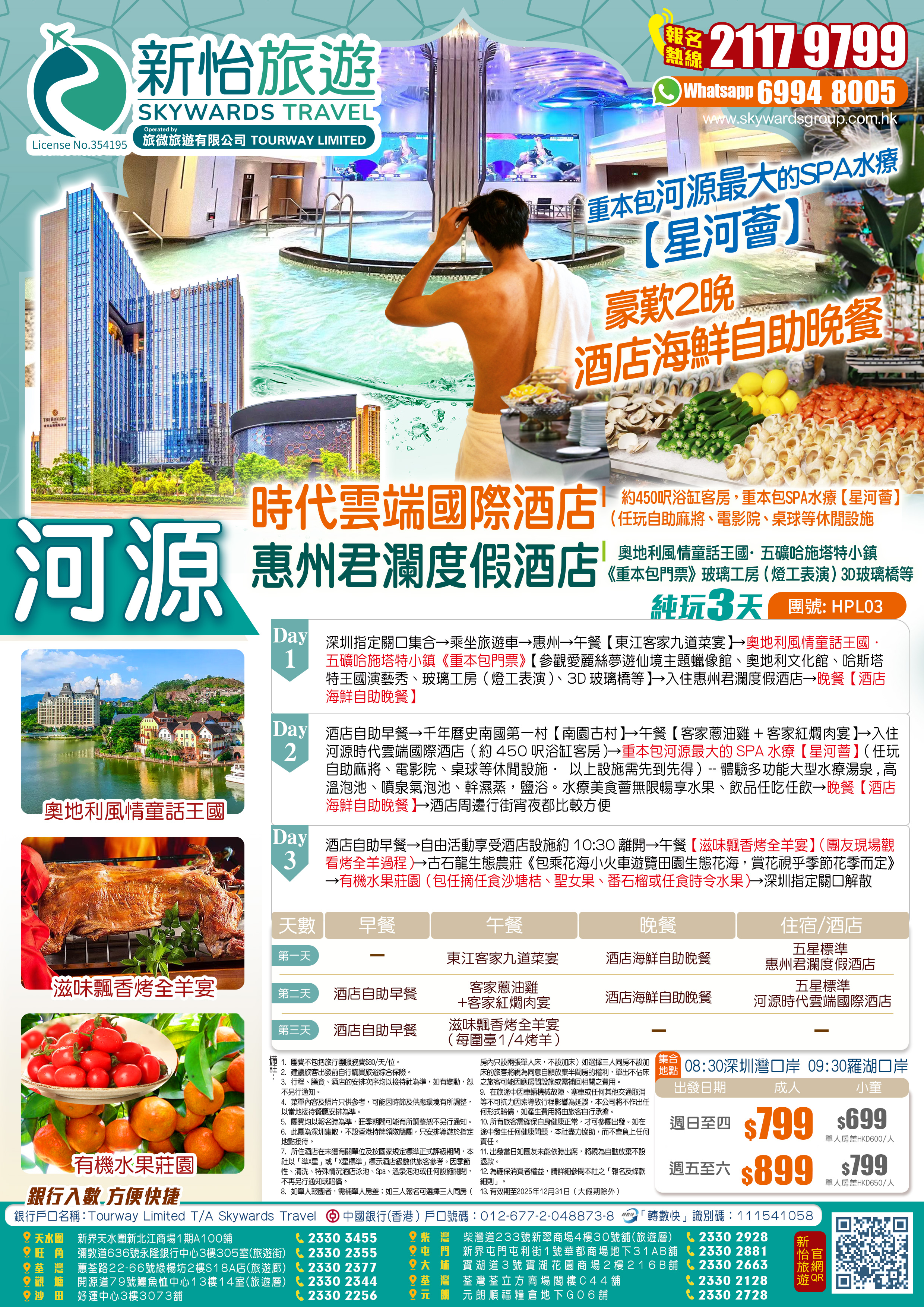河源時代雲端國際酒店+惠州君瀾度假酒店【歎2晚酒店海鮮自助晚餐】重本包星河薈SPA水療+奧地利風情童話王國(任玩麻將、水療湯泉、自助水果飲品任食任飲)純玩3天