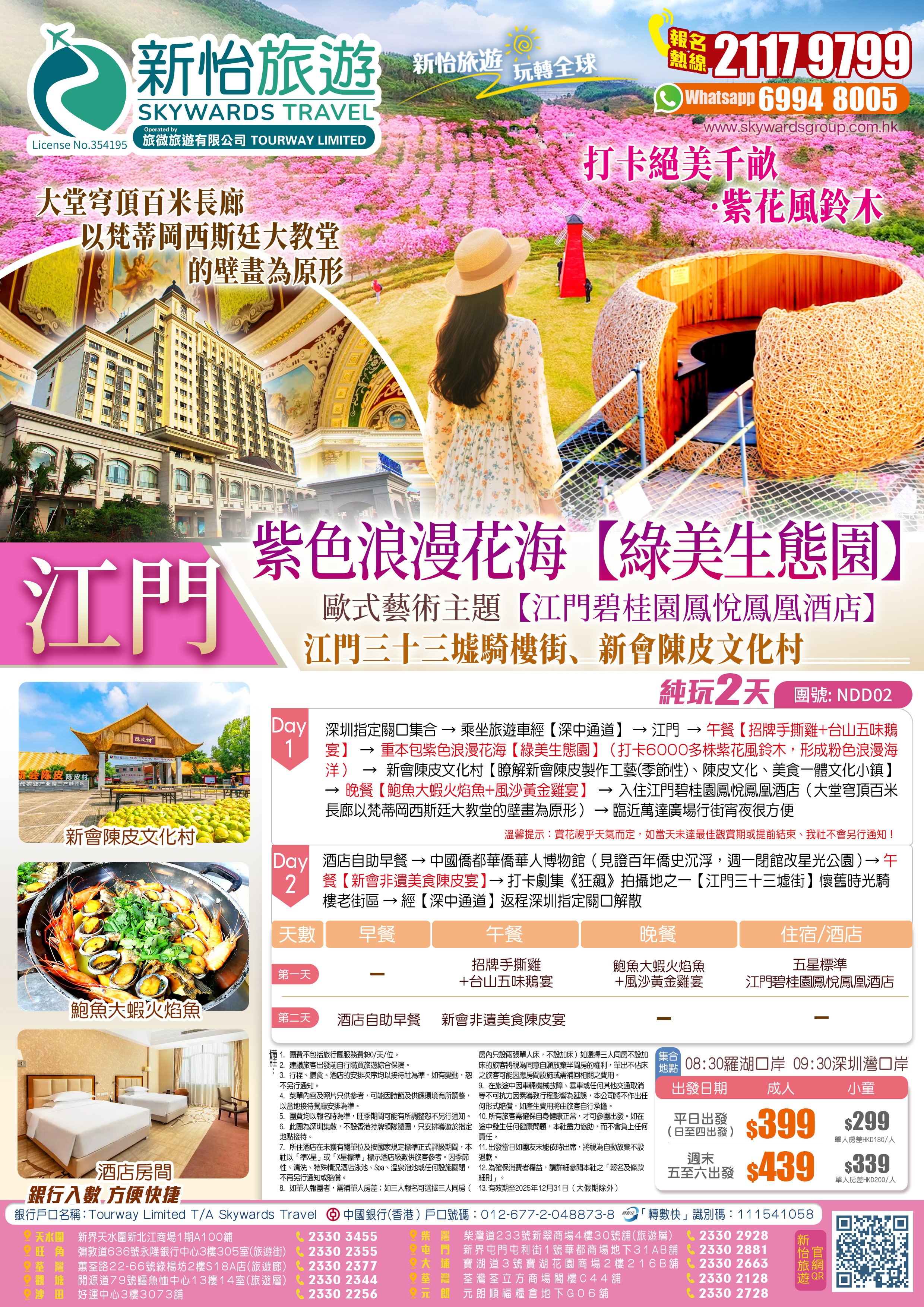 深圳指定關口集合→乘坐旅遊車經【深中通道】→江門→午餐【招牌手撕雞+臺山五味鵝宴】→重本包紫色浪漫花海【綠美生態園】(打卡6000多株紫花風鈴木,形成粉色浪漫海洋)→新會陳皮文化村【瞭解新會陳皮製作工藝(季節性)、陳皮文化、美食一體文化小鎮】→晚餐【鮑魚大蝦火焰魚+風沙黃金雞宴】→入住江門碧桂園鳳悅鳳凰酒店(大堂穹頂百米長廊以梵蒂岡西斯廷大教堂的壁畫為原形)→臨近萬達廣場行街宵夜很方便