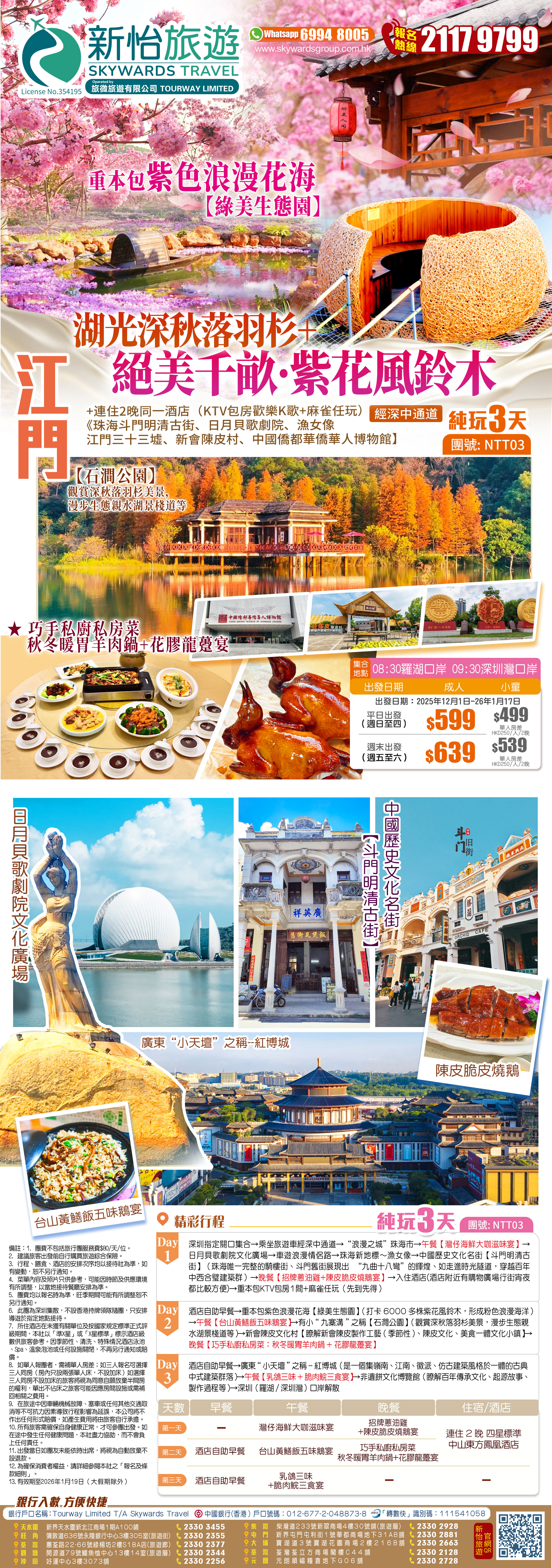 打卡絕美千畝·紫花風鈴木+湖光深秋落羽杉、珠海斗門明清古街、日月貝歌劇院、漁女像、江門三十三墟、新會陳皮村、中國僑都華僑華人博物館連住 2晚同一酒店(KTV包房歡樂K歌+麻雀任玩)純玩3天