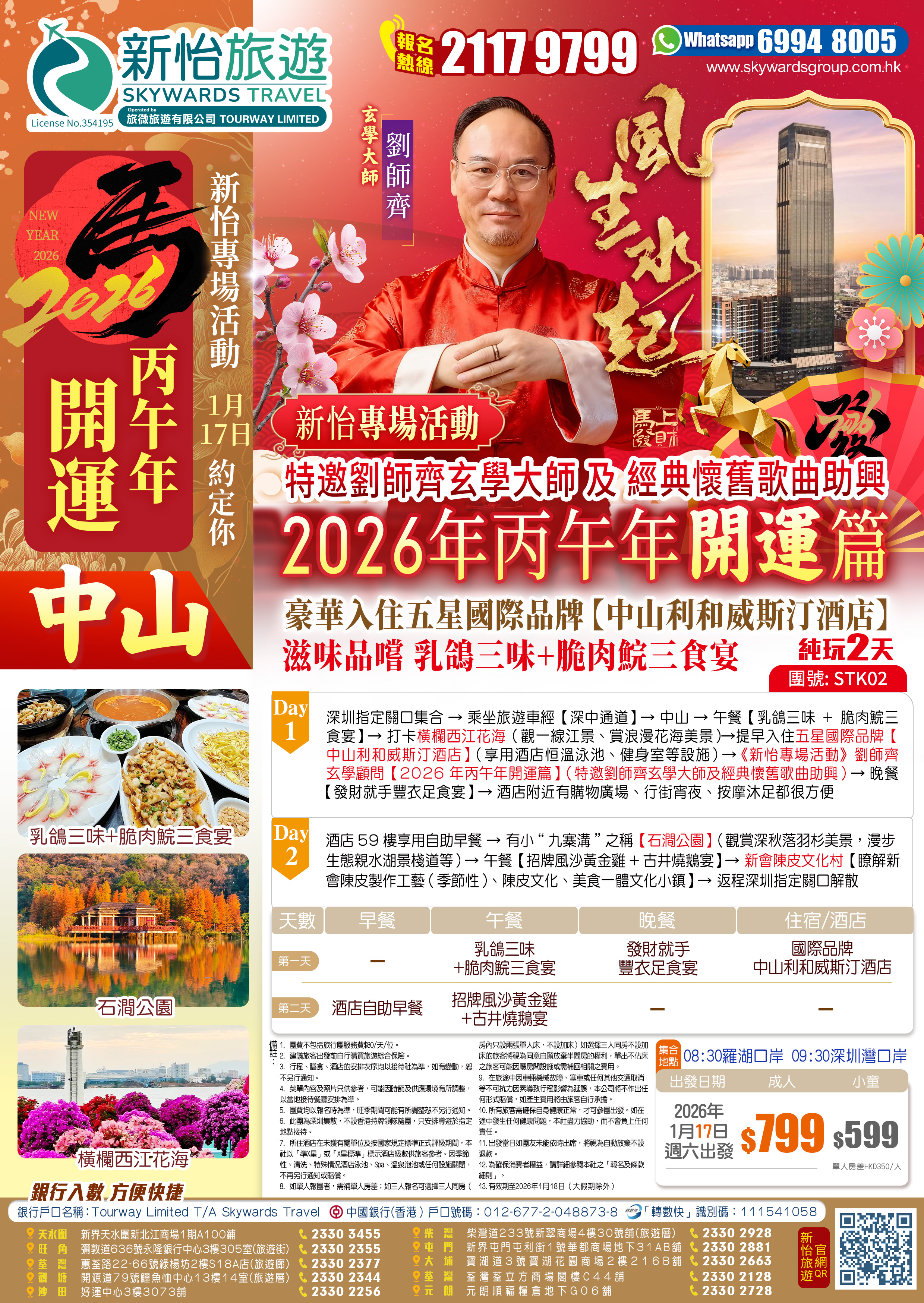 深圳指定關口集合→乘坐旅遊車經【深中通道】→中山→午餐【乳鴿三味+脆肉鯇三食宴】→打卡橫欄西江花海(觀一線江景、賞浪漫花海美景)→提早入住五星國際品牌【中山利和威斯汀酒店】(享用酒店恒溫泳池、健身室等設施)→《新怡專場活動》劉師齊玄學顧問【2026年丙午年開運篇】(特邀劉師齊玄學大師及經典懷舊歌曲助興)→晚餐【發財就手豐衣足食宴】→酒店附近有購物廣場、行街宵夜、按摩沐足都很方便