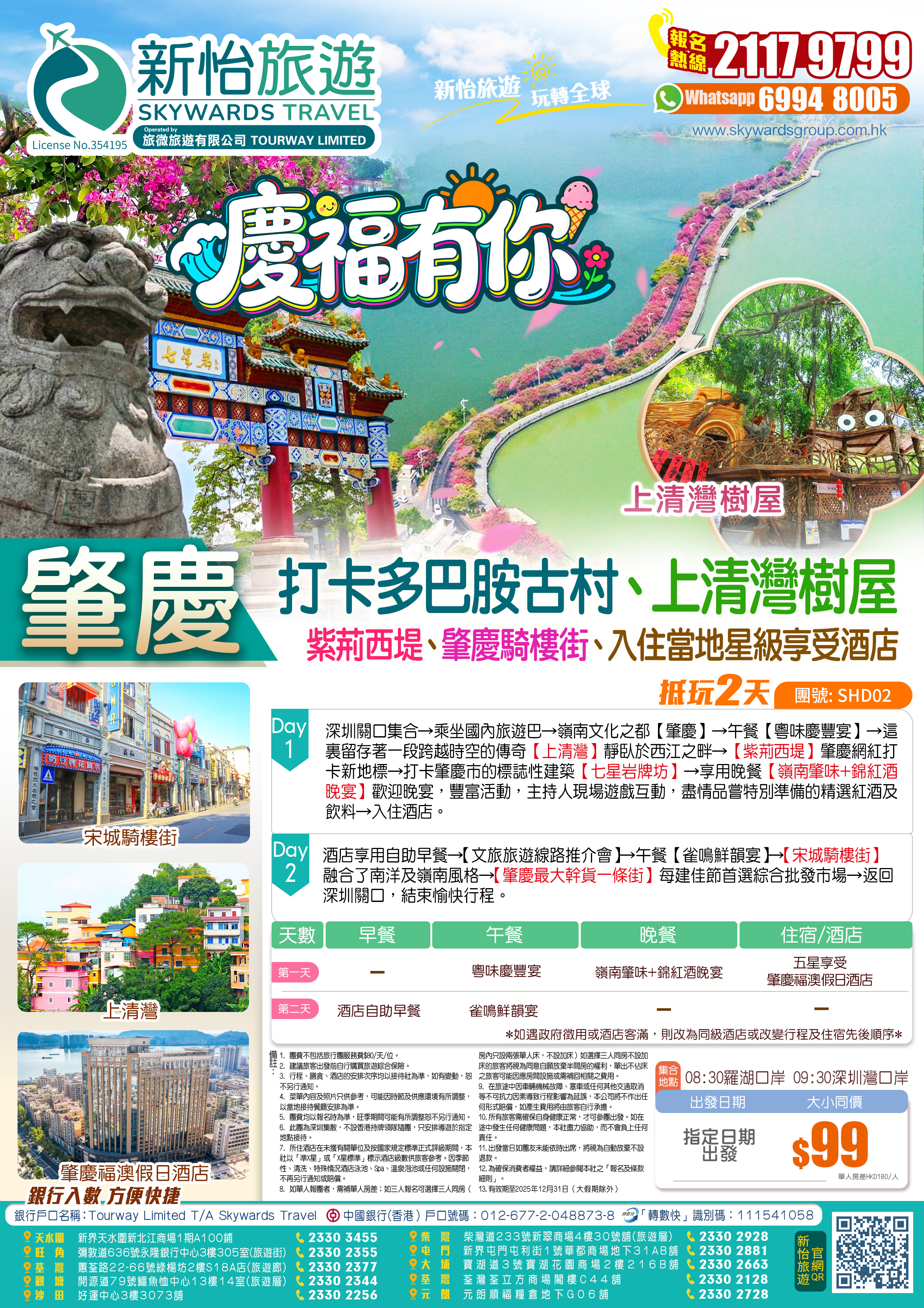 酒店享用自助早餐→【文旅旅遊線路推介會】→午餐【雀鳴鮮韻宴】→【宋城騎樓街】融合了南洋及嶺南風格→【肇慶最大幹貨一條街】每建佳節首選綜合批發市場→返回深圳關口,結束愉快行程