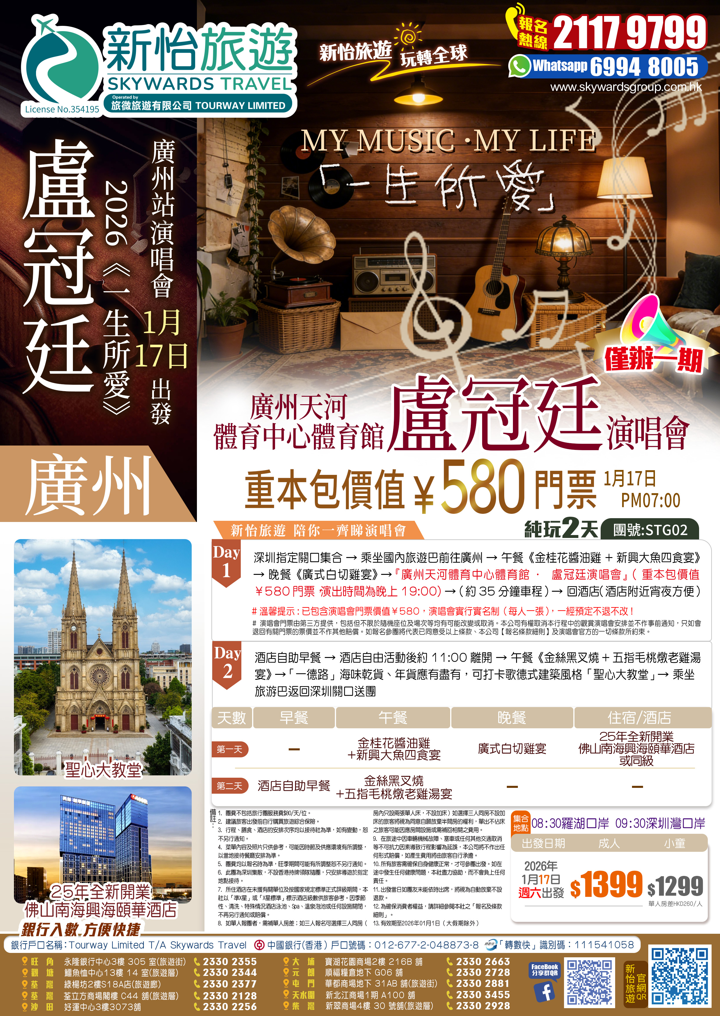 深圳指定關口集合—乘坐國內旅遊巴前往廣州—午餐《金桂花醬油雞+新興大魚四食宴》——晚餐《廣式白切雞宴》—『廣州天河體育中心體育館·盧冠廷演唱會』(重本包價值¥580門票,演出時間為晚上19:00) —(約35分鐘車程)—返回酒店(酒店附近宵夜方便)