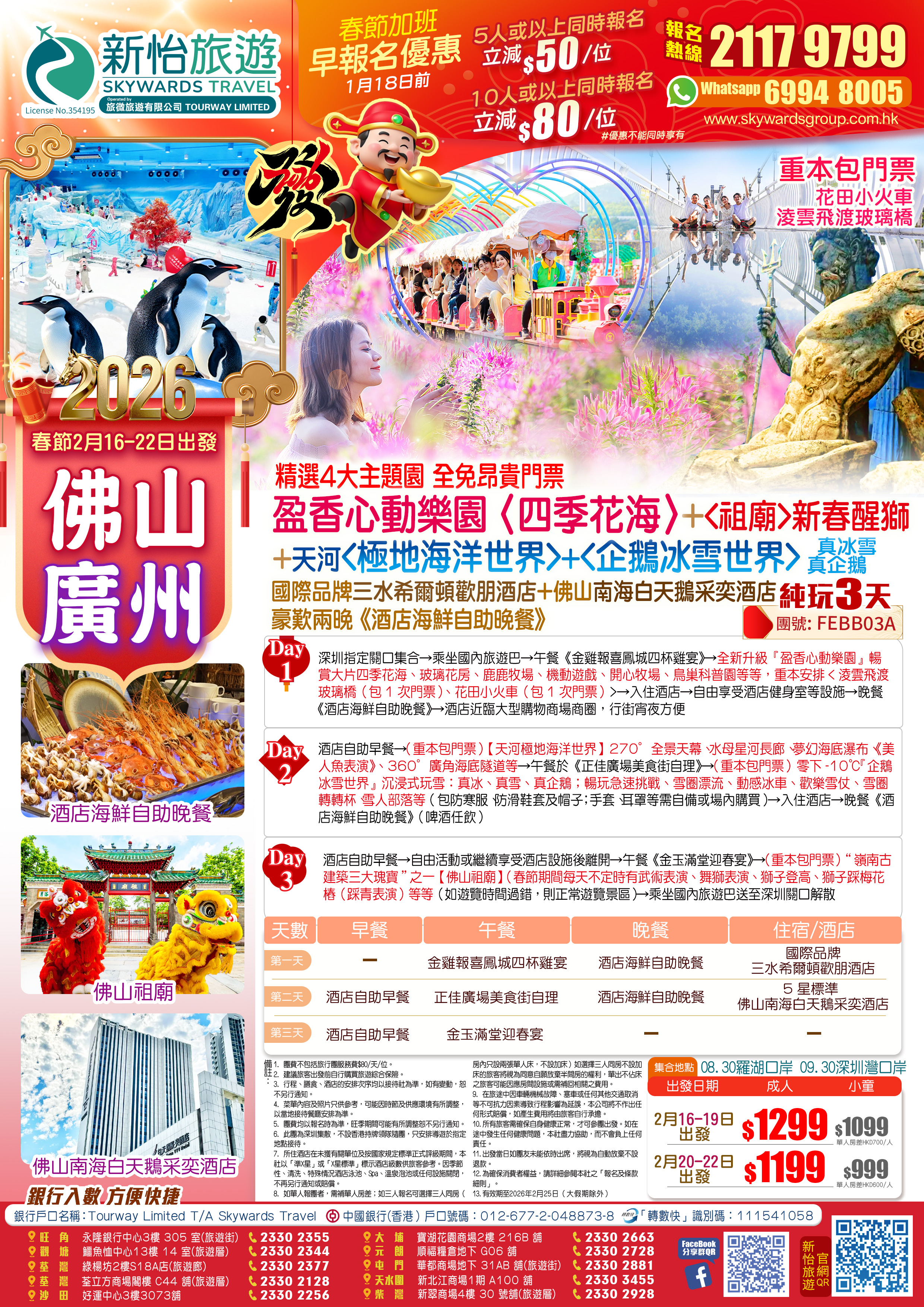 【春節加班】精選4大主題園 全免昂貴門票天河<極地海洋世界>+<企鵝冰雪世界>+盈香心動樂園〈四季花海〉佛山【南海白天鵝采奕酒店】+國際品牌酒店 嘆兩晚《酒店海鮮自助晚餐》 純玩3天