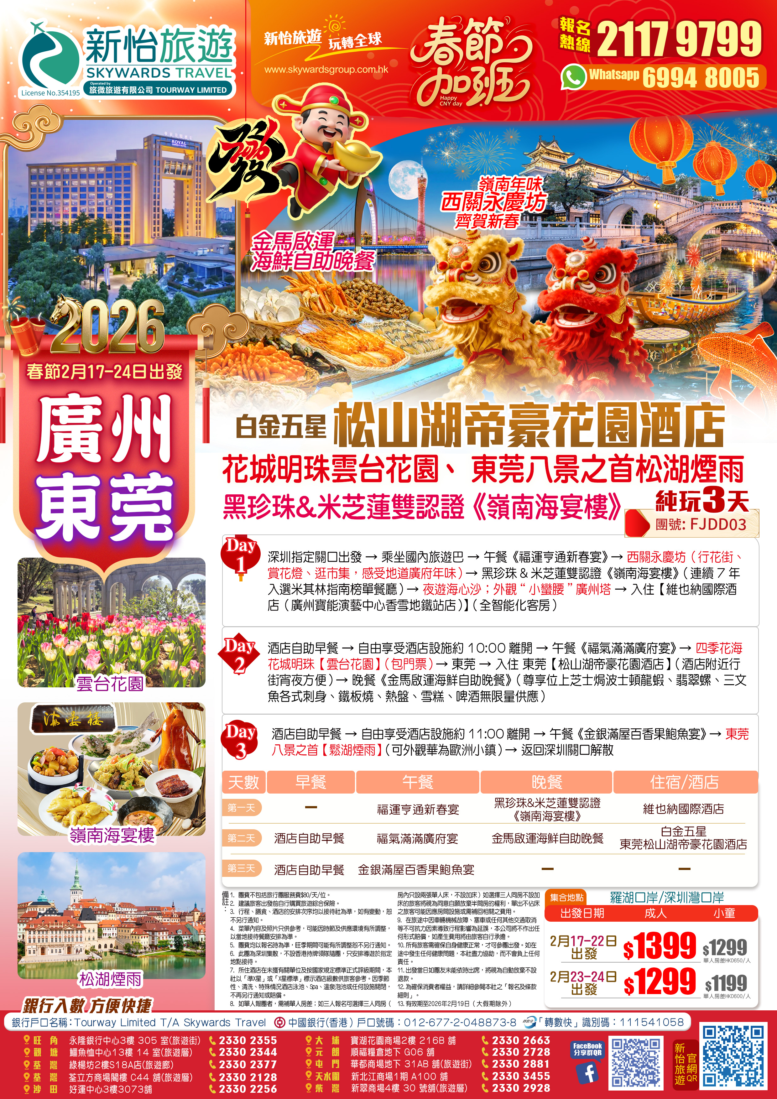 花城明珠【雲台花園】、嶺南年味【西關永慶坊】齊賀新春 白金五星【東莞ROYAL GARDEN帝豪花園酒店】 歎金馬啟運海鮮自助晚餐 黑珍珠&米芝蓮雙認證《嶺南海宴樓》純玩3天