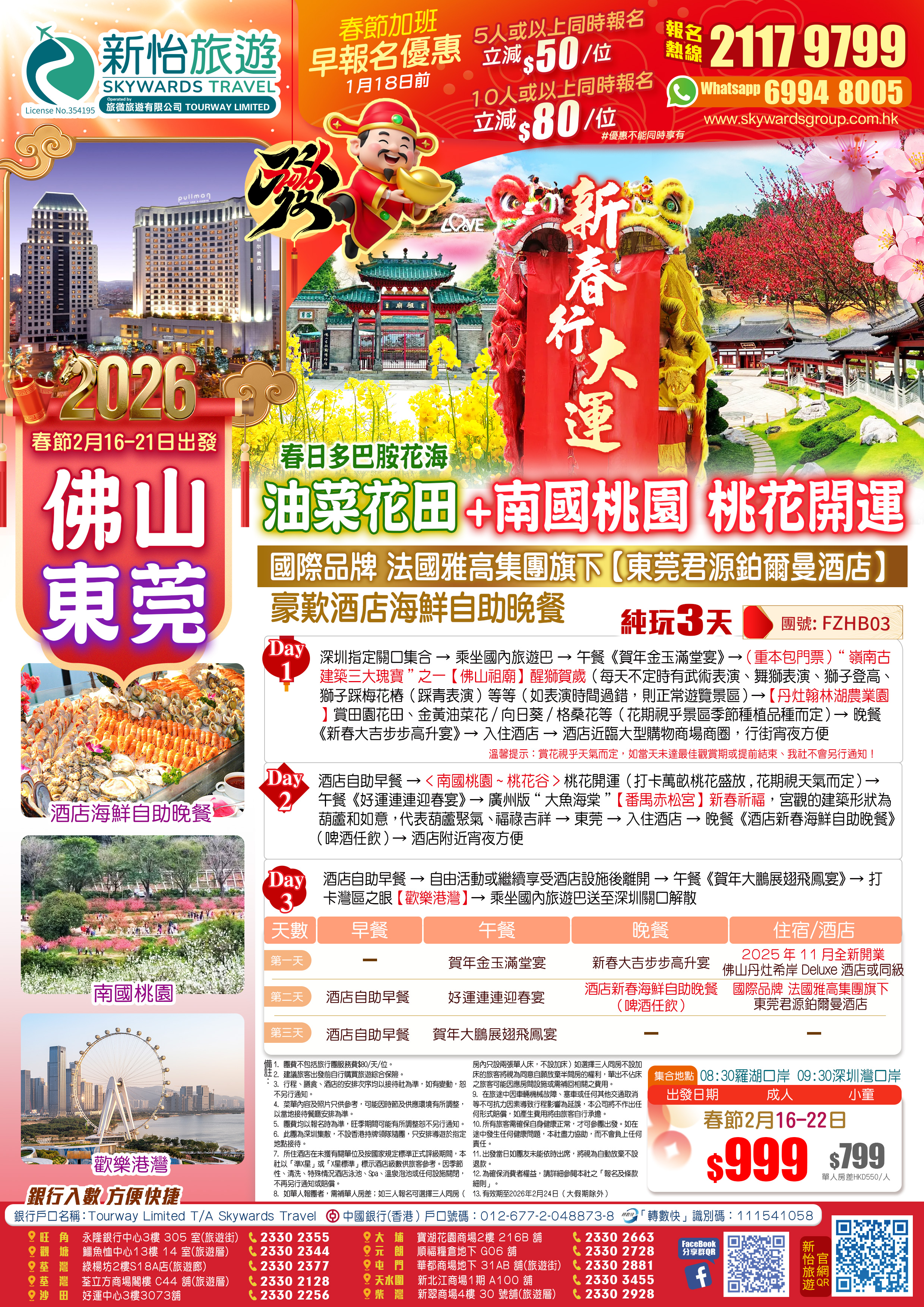 【春節加班】新春行大運 醒獅賀歲+春日多巴胺花海<油菜花田>+<南國桃園>桃花開運 國際品牌 法國雅高集團旗下【東莞君源鉑爾曼酒店】嘆《酒店海鮮自助晚餐》 佛山+東莞 純玩3天