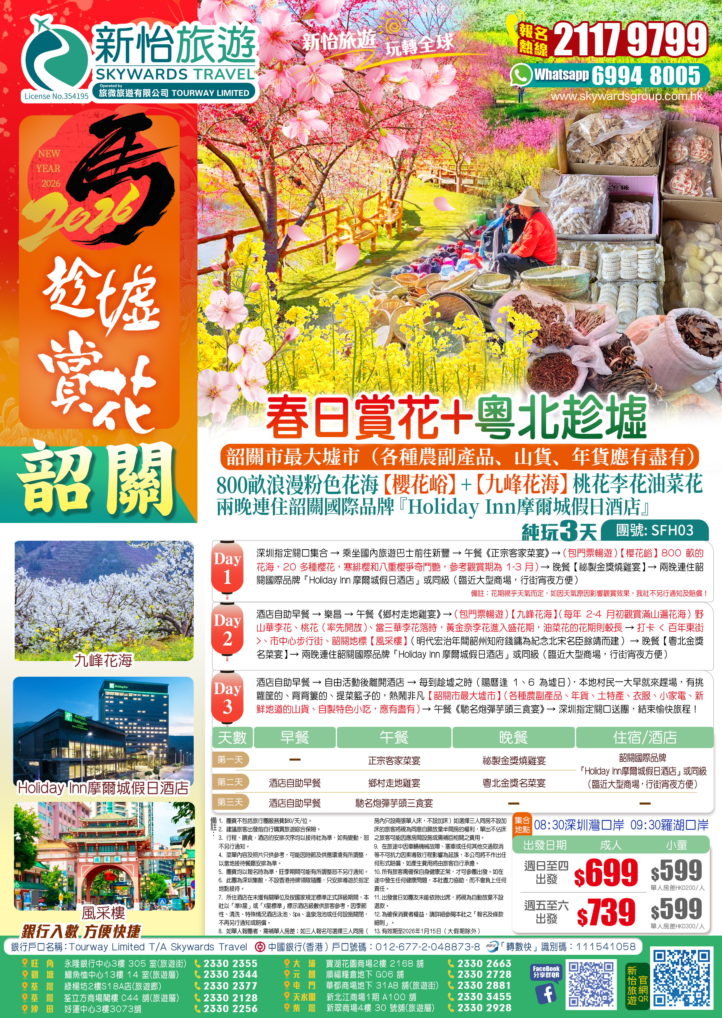 <春日賞花+粵北趁墟> 800畝浪漫粉色花海【櫻花峪】+【九峰花海】桃花李花油菜花 【北有趕集,南有趁墟】韶關市最大墟市 兩晚連住國際品牌酒店 行街宵夜方便 純玩3天