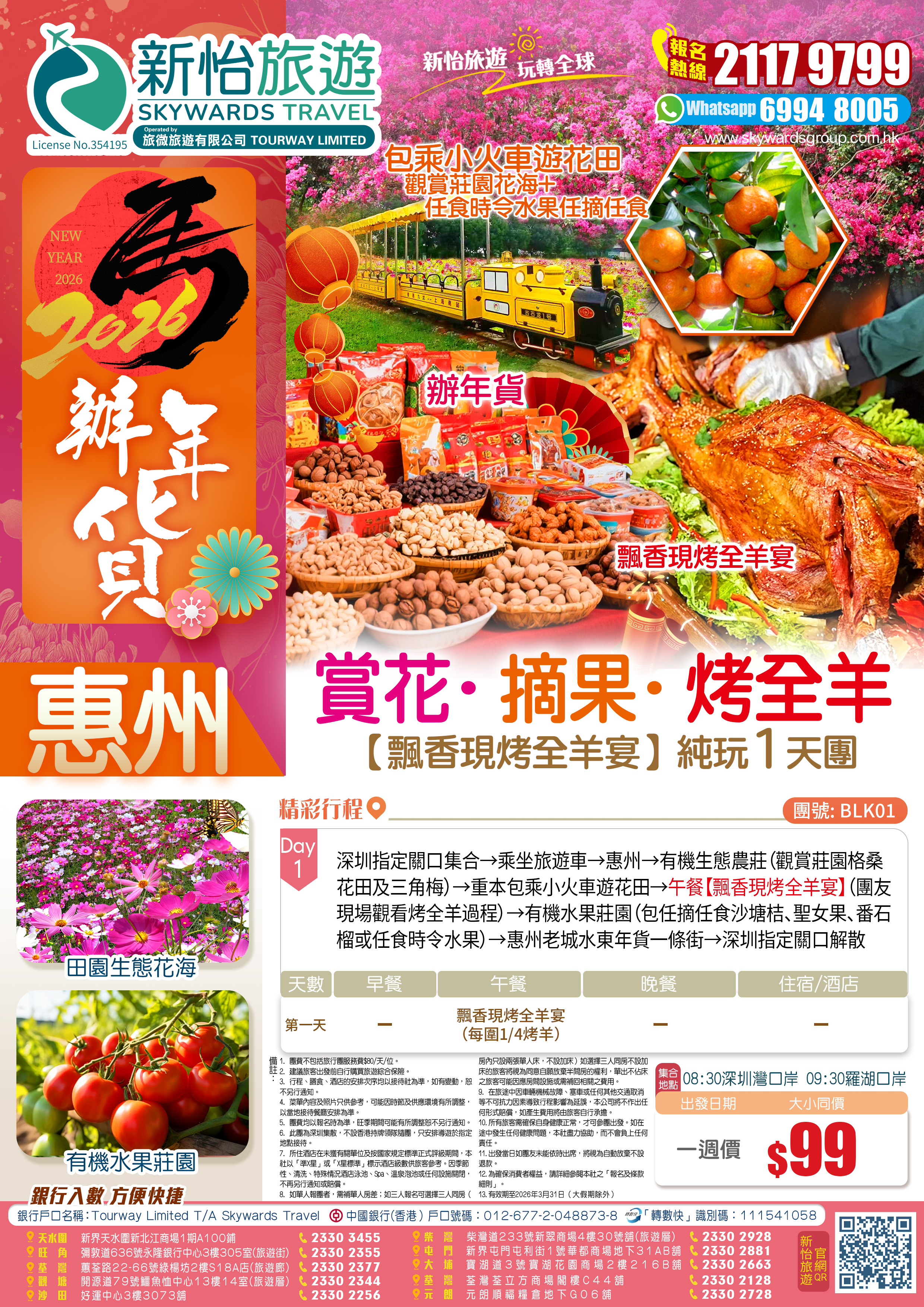 深圳指定關口集合→乘坐旅遊車→惠州→有機生態農莊(觀賞莊園格桑花田及三角梅)→重本包乘小火車遊花田→午餐【飄香現烤全羊宴】(團友現場觀看烤全羊過程)→有機水果莊園(包任摘任食沙塘桔、聖女果、番石榴或任食時令水果)→惠州老城水東年貨一條街→深圳指定關口解散