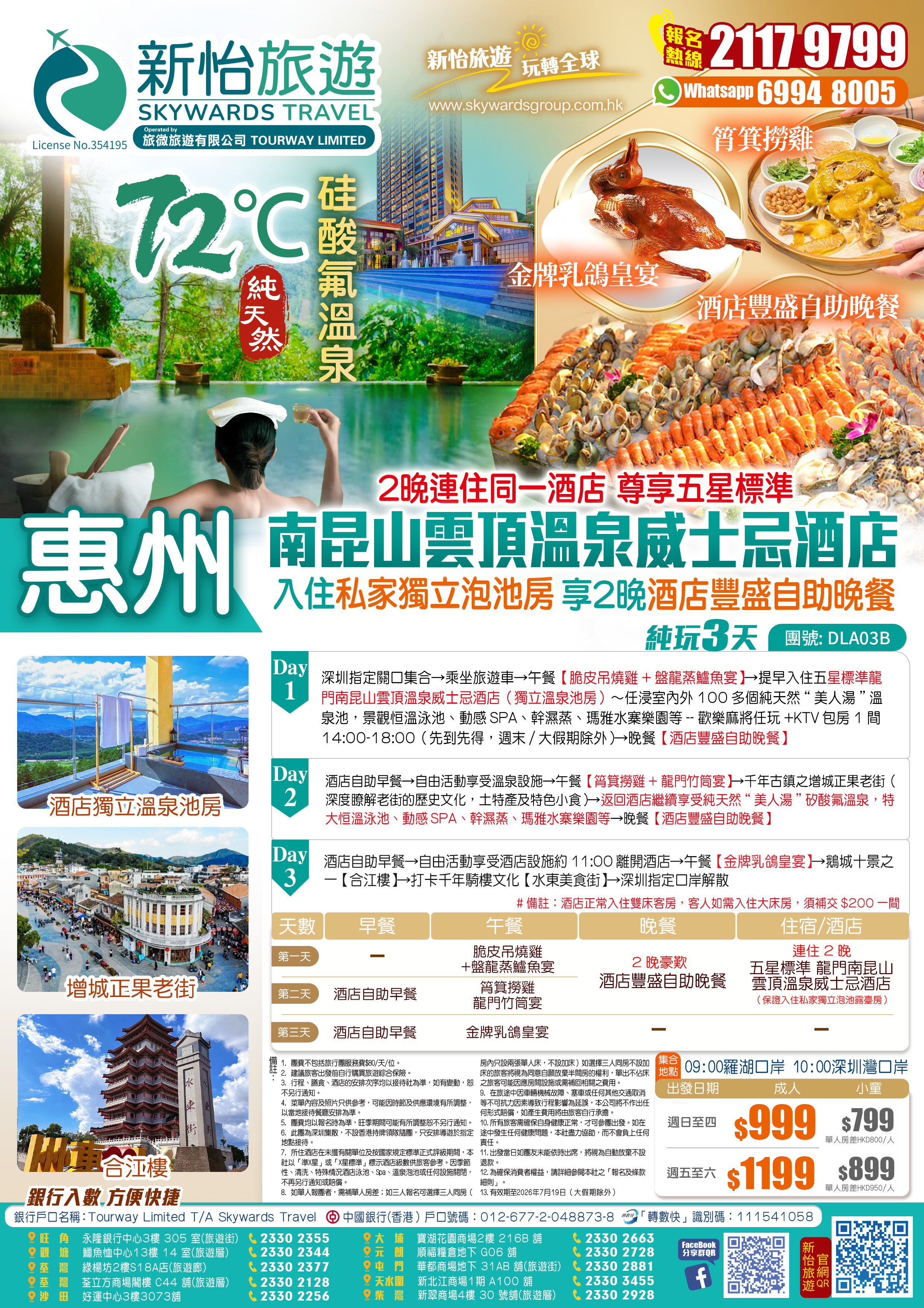 酒店自助早餐→自由活動享受溫泉設施→午餐【筲箕撈雞+龍門竹筒宴】→千年古鎮之增城正果老街(深度瞭解老街的歷史文化,土特產及特色小食)→返回酒店繼續享受純天然“美人湯”矽酸氟溫泉,特大恒溫泳池、動感SPA、幹濕蒸、瑪雅水寨樂園等→晚餐【酒店豐盛自助晚餐】