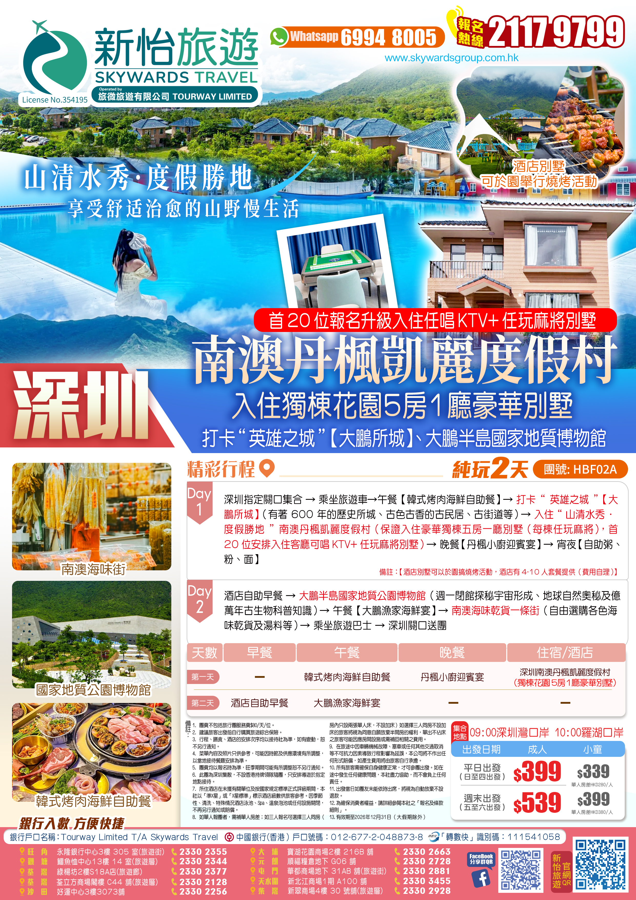 深圳指定關口集合→乘坐旅遊車→午餐【韓式烤肉海鮮自助餐】→打卡“英雄之城”【大鵬所城】(有著600年的歷史所城、古色古香的古民居、古街道等)→入住“山清水秀·度假勝地”南澳丹楓凱麗度假村(保證入住豪華獨棟五房一廳別墅(每棟任玩麻將),首20位安排入住客廳可唱KTV+任玩麻將別墅)→晚餐【丹楓小廚迎賓宴】→宵夜【自助粥、粉、面】