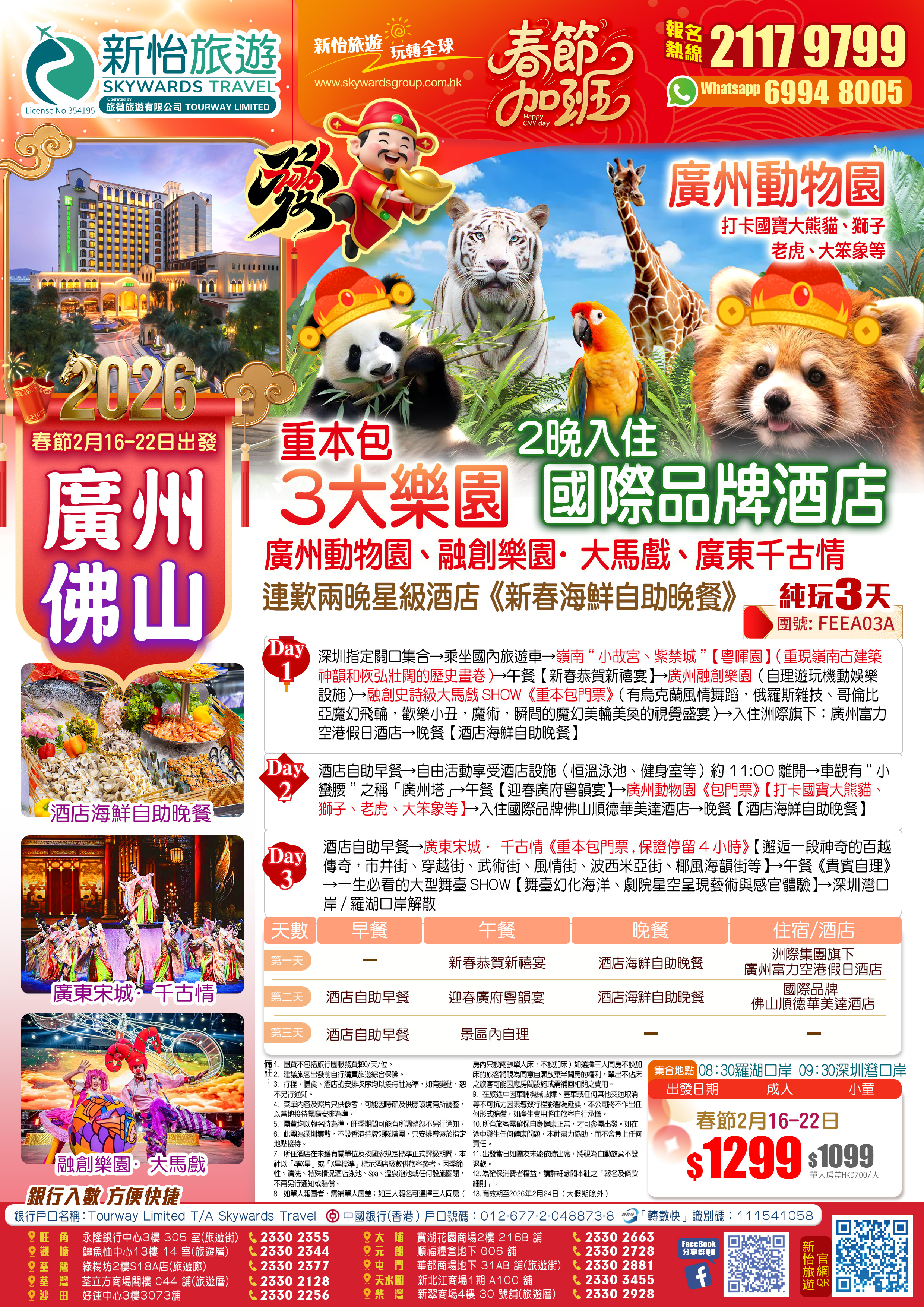 (新春加班線)重本包3大樂園【廣州動物園、融創樂園·大馬戲、廣東千古情】兩晚入住國際品牌酒店+兩晚歎新春酒店海鮮自助晚餐純玩3天