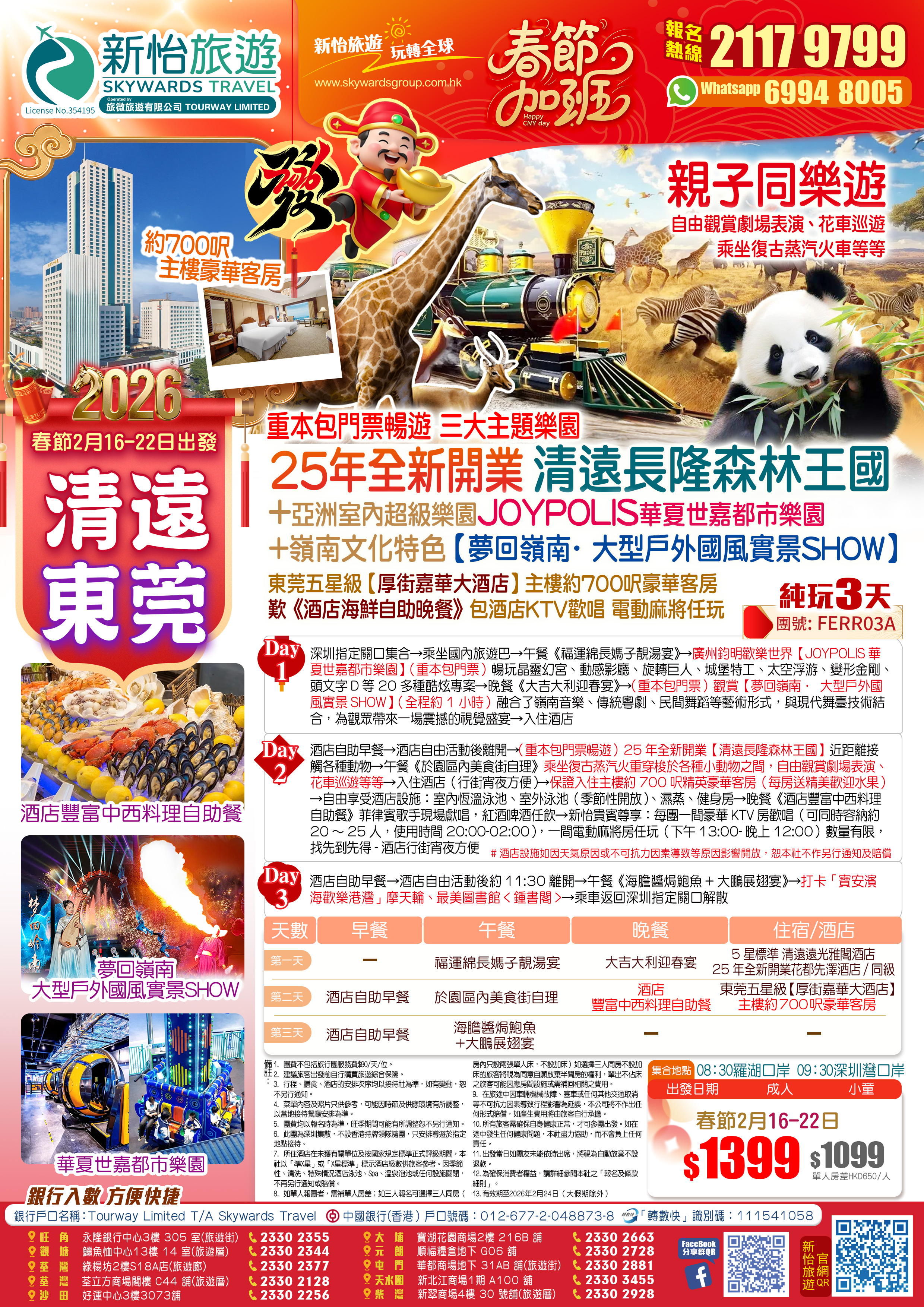 【春節加班】親子同樂遊 25年全新開業「清遠長隆森林王國」+「夢回嶺南」+ 亞洲室內超級樂園「JOYPOLIS華夏世嘉都市樂園」東莞五星級【厚街嘉華大酒店】 嘆《酒店海鮮自助晚餐》 包酒店KTV歡唱 電動麻將任玩 純玩3天