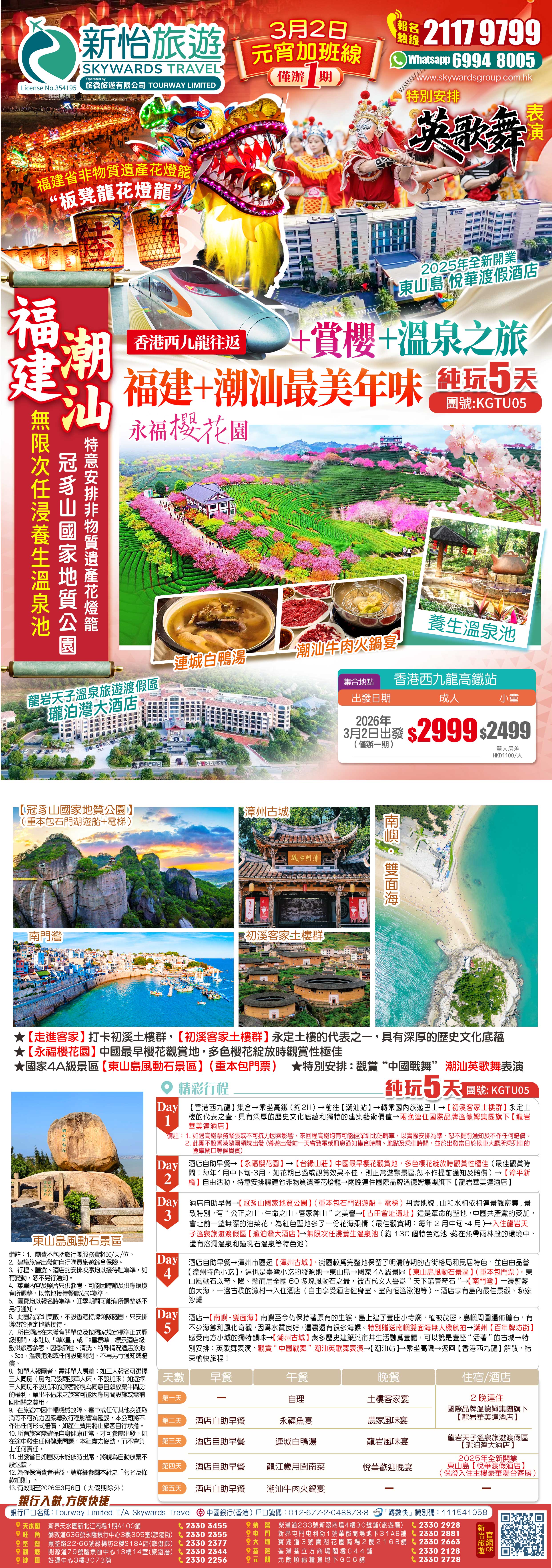 【元宵加班·僅辦一期】"最美年味"福建+潮汕最土年味+賞櫻+溫泉之旅 住五星標準酒店 “中國最美櫻花聖地”永福櫻花 特別安排<英歌舞表演> 西九龍往返高鐵 純玩5天