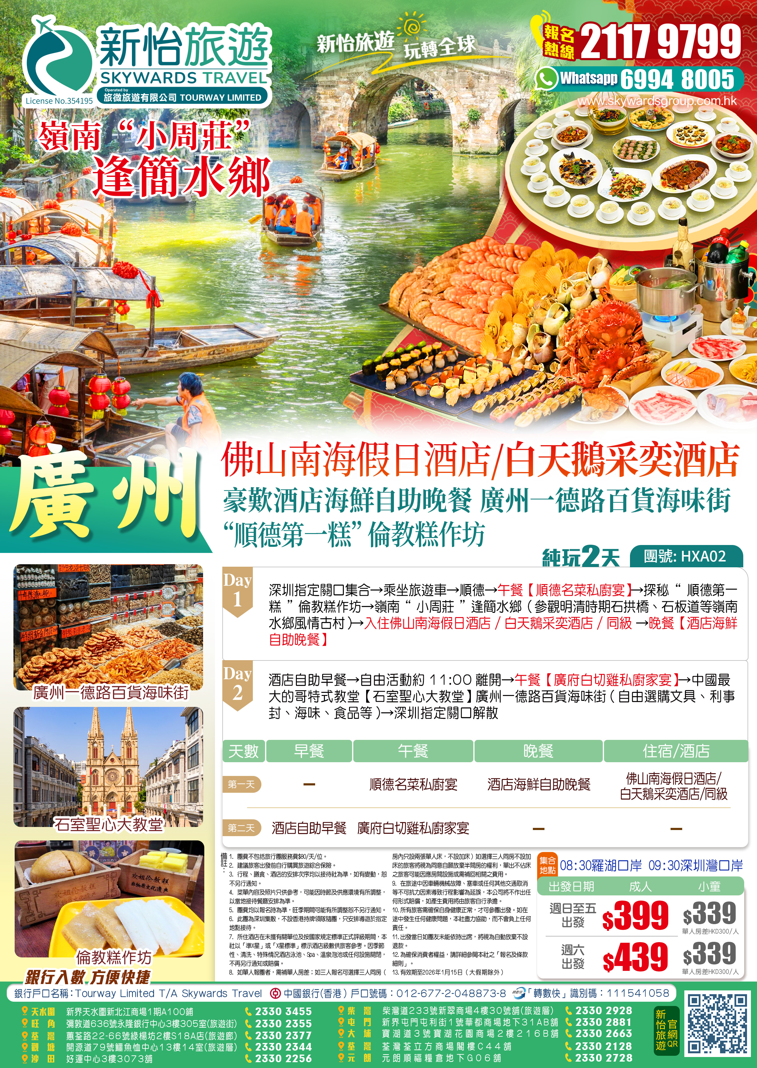 深圳指定關口集合→乘坐旅遊車→順德→午餐【順德名菜私廚宴】→探秘“順德第一糕”倫教糕作坊→嶺南“小周莊”逢簡水鄉(參觀明清時期石拱橋、石板道等嶺南水鄉風情古村)→入住【佛山南海假日酒店/白天鵝采奕酒店】歎【酒店海鮮自助晚餐】→晚餐【酒店海鮮自助晚餐】