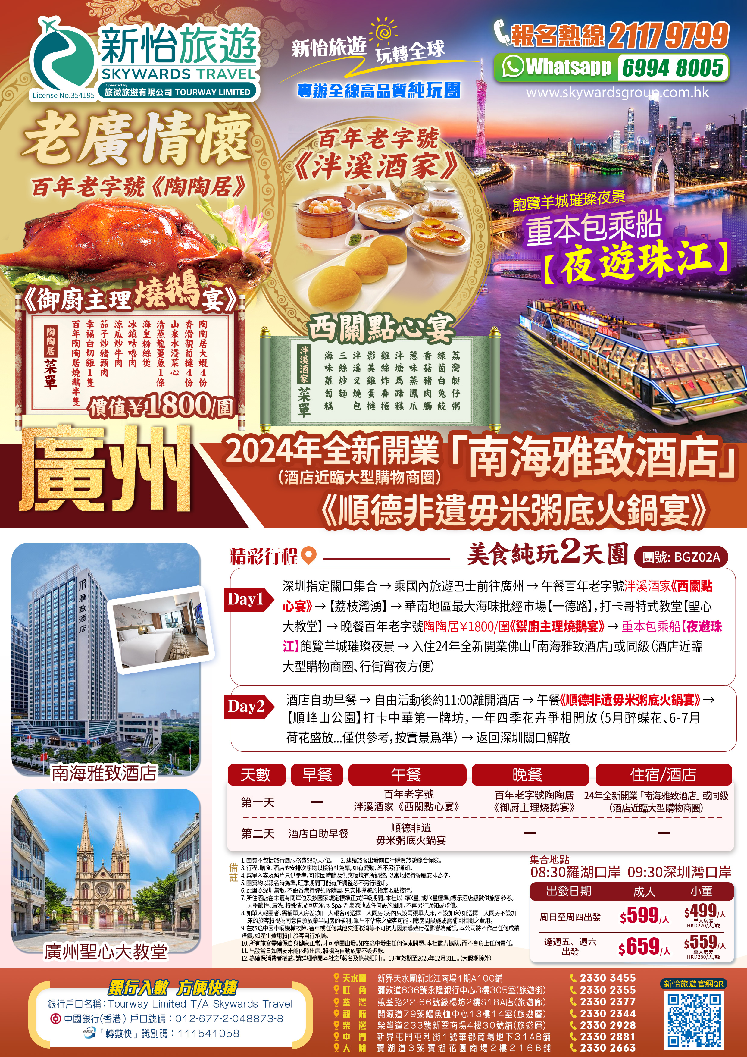 【老廣情懷】 陶陶居¥1800/围《御厨主理燒鵝宴》 +百年老字號號泮溪酒家《西關點心宴》 重本包乘船【夜遊珠江】飽覽羊城璀璨夜景 純玩2天團