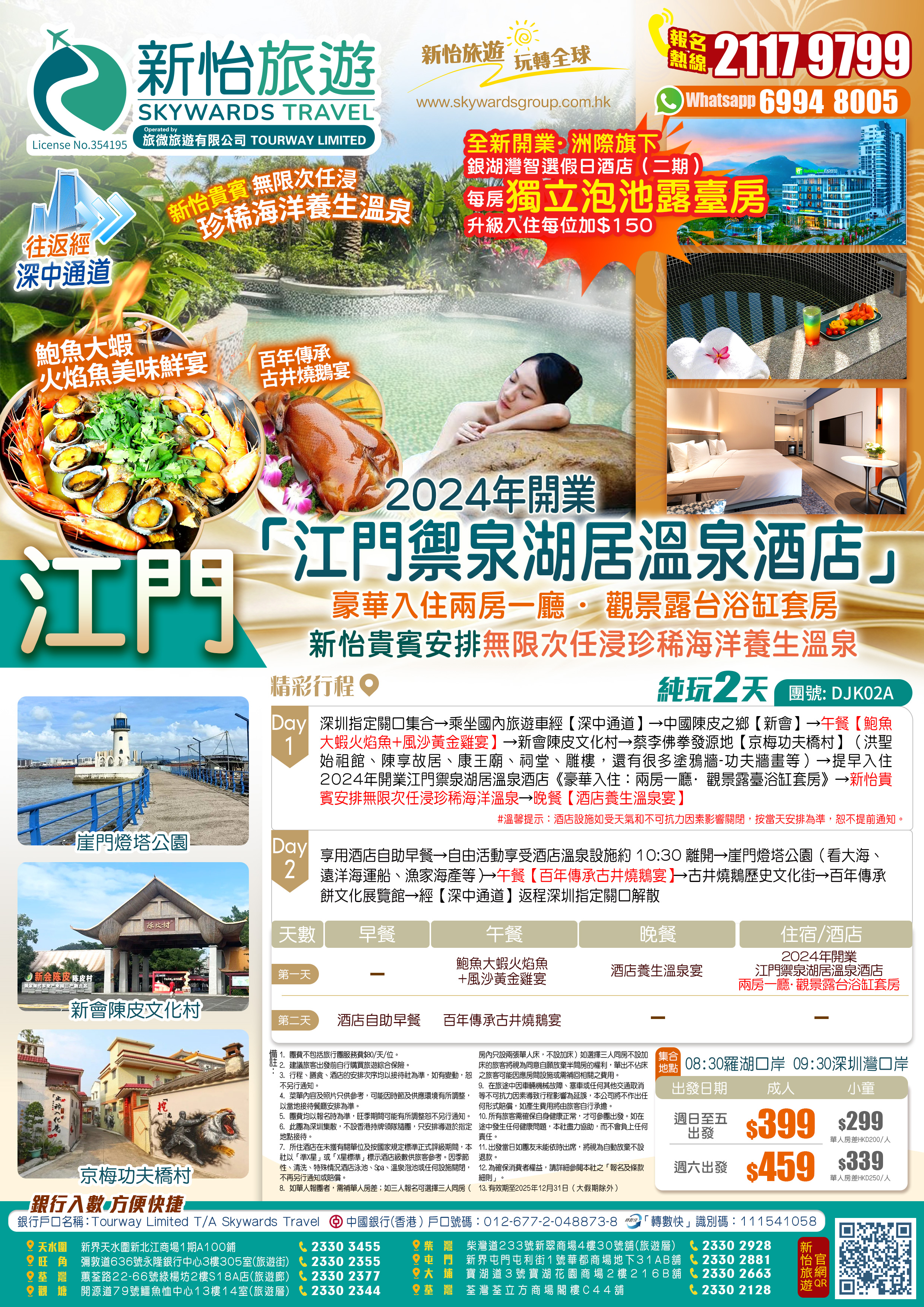 深圳指定關口集合→乘坐國內旅遊車經【深中通道】→中國陳皮之鄉【新會】→午餐【鮑魚大蝦火焰魚+風沙黃金雞宴】→新會陳皮文化村→蔡李佛拳發源地【京梅功夫橋村】(洪聖始祖館、陳享故居、康王廟、祠堂、雕樓,還有很多塗鴉牆-功夫牆畫等)→提早入住2024年開業江門禦泉湖居溫泉酒店《豪華入住:兩房一廳·觀景露臺浴缸套房》→新怡貴賓安排無限次任浸珍稀海洋溫泉→晚餐【酒店養生溫泉宴】