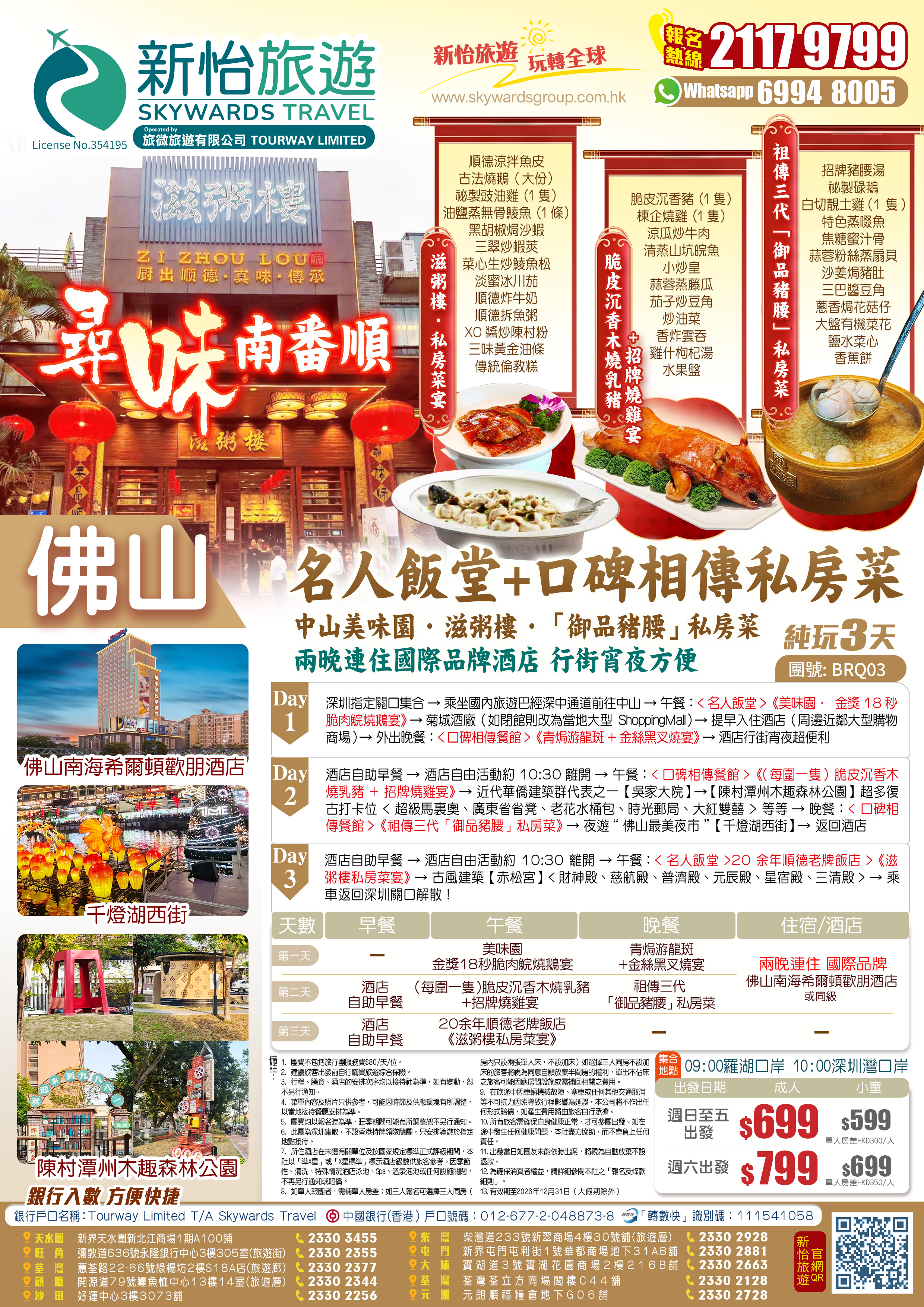 酒店自助早餐—酒店自由活動約10:30離開—午餐:<名人飯堂>20余年順德老牌飯店>《滋粥樓私房菜宴》—古風建築【赤松宮】<財神殿、慈航殿、普濟殿、元辰殿、星宿殿、三清殿>—乘車返回深圳關口解散!