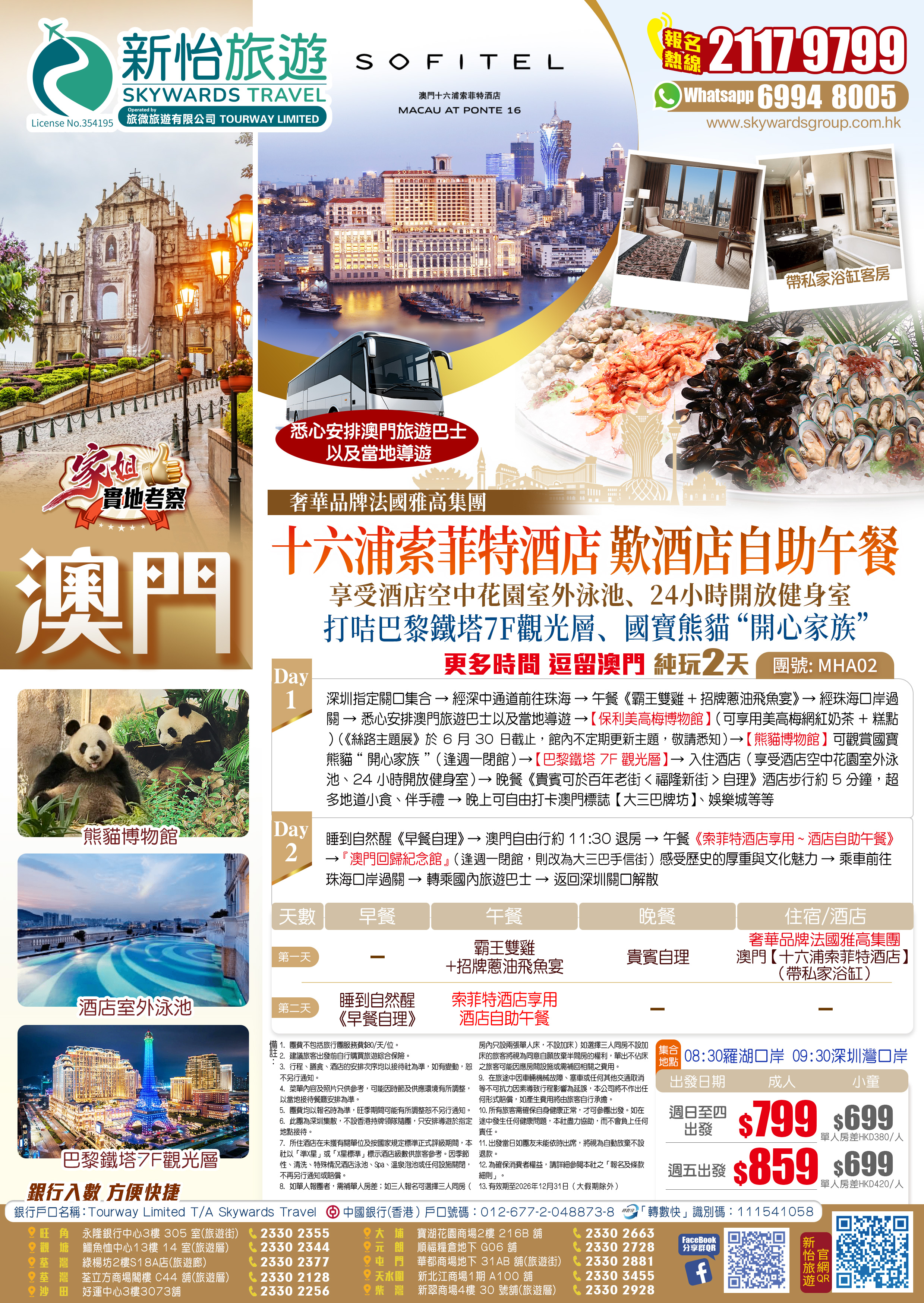 睡到自然醒《自理早餐》—澳門自由行約11:30退房—午餐《索菲特酒店享用~酒店自助午餐》—『澳門回歸紀念館』(逢週一閉館,則改為大三巴手信街)感受歷史的厚重與文化魅力—乘車前往珠海口岸過關—轉乘國內旅遊巴士—返回深圳關口解散