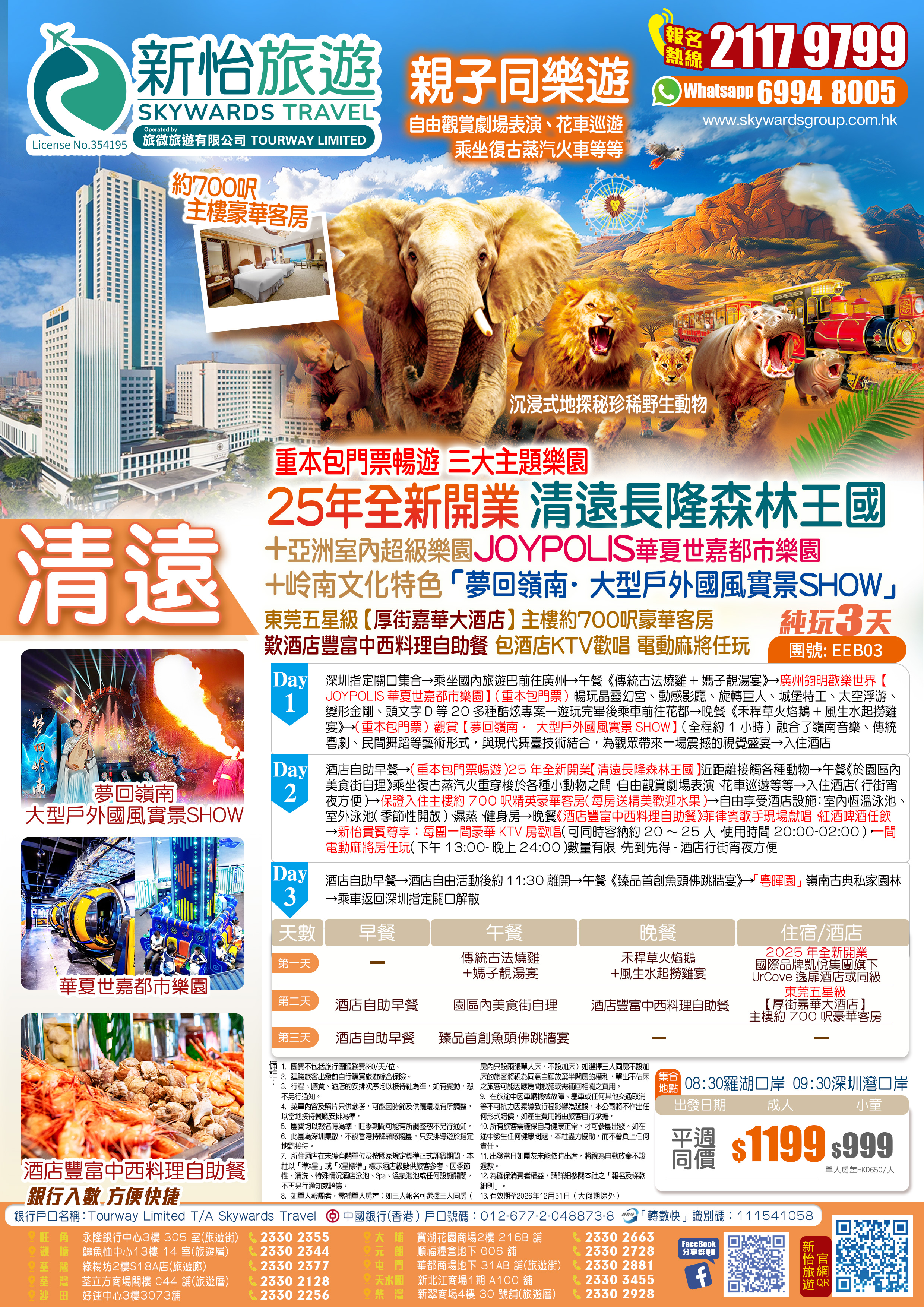 <親子同樂遊>25年全新開業「清遠長隆森林王國」+「夢回嶺南·實景SHOW」+ 亞洲室內超級樂園「JOYPOLIS華夏世嘉都市樂園」東莞五星級【厚街嘉華大酒店】主樓约700呎豪華客房 嘆《酒店海鮮自助晚餐》 包酒店KTV歡唱 電動麻將任玩 純玩3天