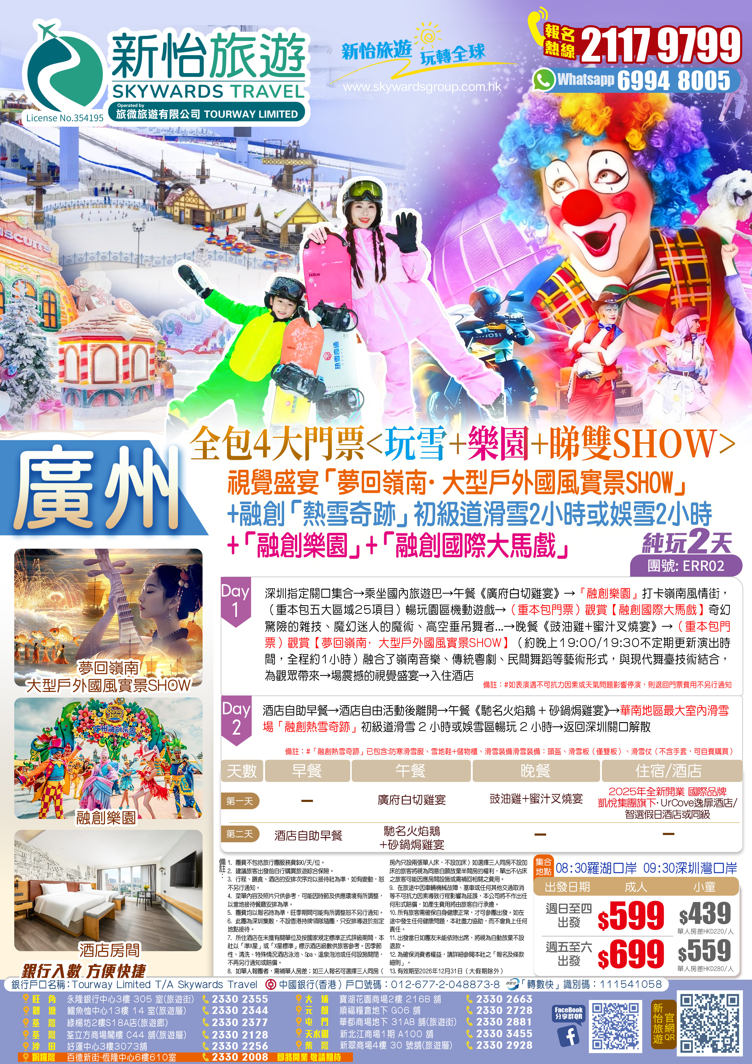 酒店自助早餐—酒店自由活動後離開—午餐《馳名火焰鵝+砂鍋焗雞宴》—華南地區最大室內滑雪場「融創熱雪奇跡」初級道滑雪2小時或娛雪區暢玩2小時—返回深圳關口解散